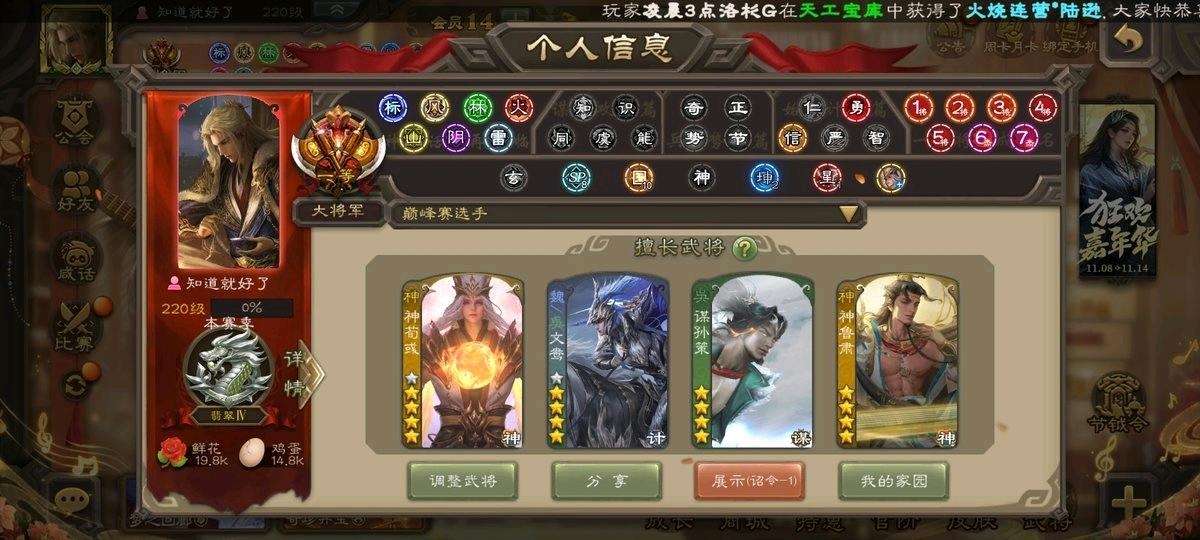 【VIP等级】VIP14[官阶]一等大将军【游戏等级]220【史诗武将数量】100【所有武将数量】497【所有皮肤数量]671【动态皮肤数量]113 【武将】回廊神荀彧回廊神鲁肃势魏延友诸葛势太史慈神郭嘉曹髦陆郁生刘焉神华佗十常侍谋夏侯惇回廊文鸯神孙策神司马懿神甘宁谋诸葛谋关羽势于吉谋貂蝉回廊杜预谋孙策回廊谋黄盖孙寒华张奋刘璋杨彪裴秀祢衡谋张角神太史慈谋黄月英谋夏侯氏 【动态皮肤]逐鹿天下·曹操,洛水神韵·甄姬,明珠耀躯·甄姬,以身证道·郭嘉,驱虎吞狼·荀彧,牛年清明·曹丕,