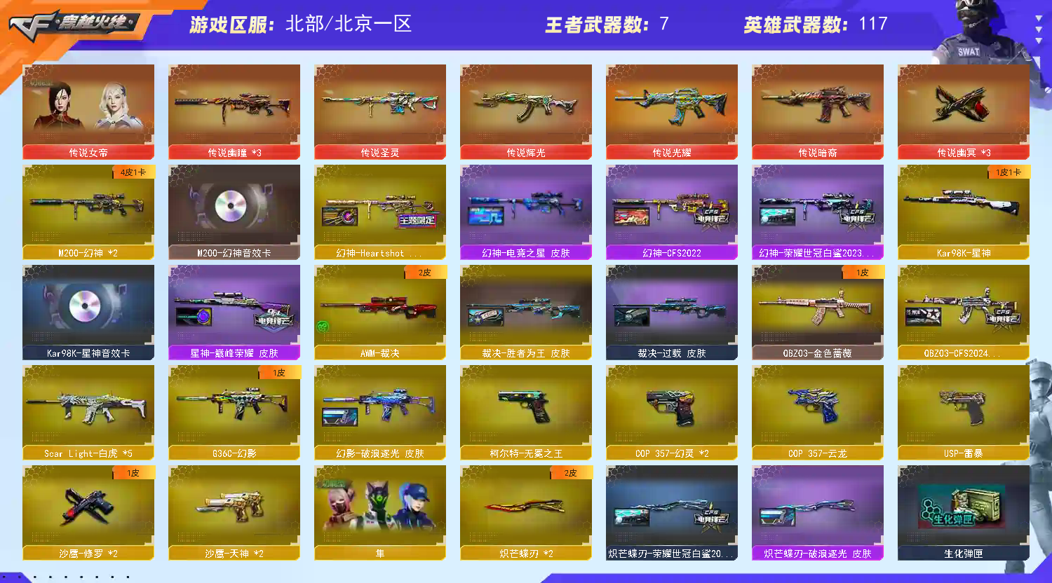 感谢您的租用,祝您生活愉快,万事如意!★★★本号已备案,充值过十万,因开挂,宏,第三方等导致封号一律报警并法院起诉,配合平台调取实名,支付账号,ip地址,绝对绝对必追究到底。根据《民法典》第113条和第127条规定,原价赔偿,请老板们勿以身试险哦 爆破生化挑战全能号,传说女帝隼鹰影豹等10四防角色,三把传说幽瞳和三幽冥,传说光耀暗裔圣灵辉光,幻影带皮,银翼,优质雷暴副武器手枪,挑战9阶6白虎,臻选金狐套 双蝴蝶刀都带皮,6烈龙双蝴蝶小人枪,幻灵,生化弹匣,机枪和冲锋枪弹匣,挑战弹匣 王者幻神 双幻神4皮+音效卡:女团皮 白鲨2023皮 cfs2022皮 电竞之星皮 星神巅峰荣耀皮+音效卡,王者星霆 裁决2皮:过载皮 胜者为王皮 雷神绝版十周年臻藏皮肤+音效卡,王者冰魄火魄 王者蔷薇,qbzcfs2024皮肤 6白虎 王者白虎 黑骑士破界皮+音效卡;USP-雷暴,柯尔特-无冕之王,传说幽冥,炽芒蝶刃,传说女帝,隼,电竞教官-云悠悠,