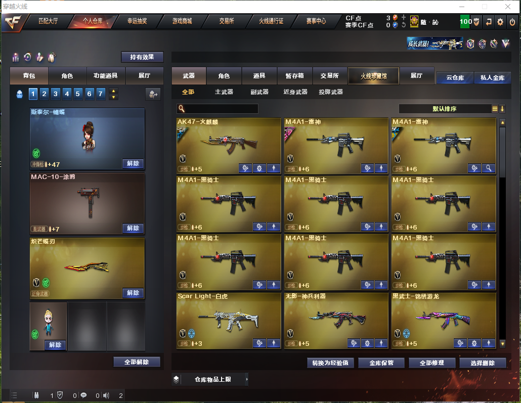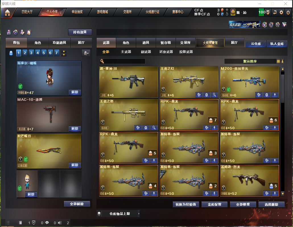 【主武器】M200-幻神竞技荣光/白虎/斯太尔蝴蝶/异变清道夫/毒蜂/⑥烈龙④炼狱③盘龙/⑥黑骑士/②雷神/火麒麟/无影/黑武士/王者之幻觉醒/王者之怒觉醒/机甲撕裂者3/圣炎切割者3/深渊巨龙咆哮3/激光毁灭者3/神圣爆裂者3/死亡之眼庆典CFS2021 【副武器】柯尔特-竞技荣光/USP-雷暴/③柯尔特电竞装甲/修罗/③涂鸦手枪 【近身武器】炽芒蝶刃/擎天-竞技荣光/擎天/迷你牛牛/迷你裂空之翼/手斧镜/屠龙秘银/招财猫枪王排位 【手雷】迷你生化手雷/⑤高爆竞技荣光+烟闪/③电竞装甲恶棍+烟闪/高爆云龙/ 【角色】传说影煞+四防/电竞教官云悠悠+四防/王者葵惊若翩鸿/灵动武士/圣灵戒/魔龙戒 【皮肤】雷神-宠儿皮肤/雷神-荣耀之魄皮肤/火麒麟-star皮肤/炼狱-星空皮肤/火麒麟sta法拍房 【音效卡】0 【道具】紫金大元首/全背包/VIP/烟雾头/AC/闪光镜/钩子/防化服/变异宝贝/疯狂宝贝/灵魂忍者/迷雾幽灵/绿巨人/全弹夹/终极猎手荒漠刀客皮肤/生化爆破全装;USP-雷暴,炽芒蝶刃,传说影煞,电竞教官-云悠悠,RPK-盘龙,Scar Light-白虎,