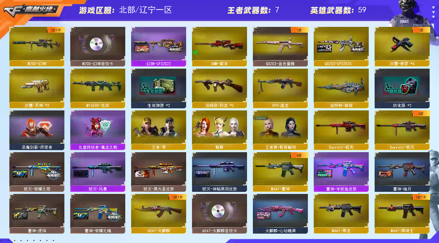 幻神CFS+音效卡 5烈龙 火麒麟/黑骑士三件套 白虎蓝兔 玄武 QBZ2024 朱雀蛇隐宗 王者之势/翼/击觉醒版 王者龙血觉醒版 毁灭荣耀之怒 雷神荣耀之魄 2沙鹰天神 4修罗 炫金火麒麟 蝴蝶刀枪王排位 魅影 蛇隐宗 蛇姬 王者零 王者葵惊若翩鸿 铁骑荣耀 零水下丽影;RPK-盘龙,QBZ03-金色蔷薇,M200-幻神,