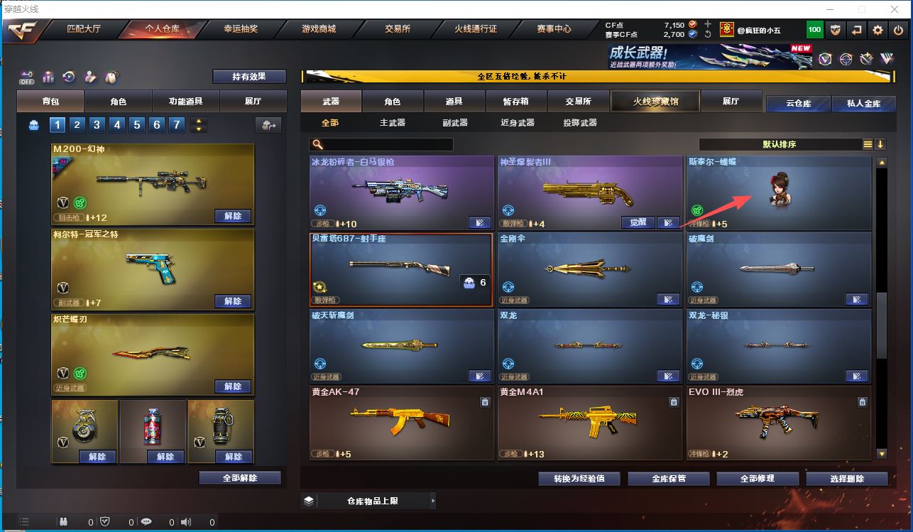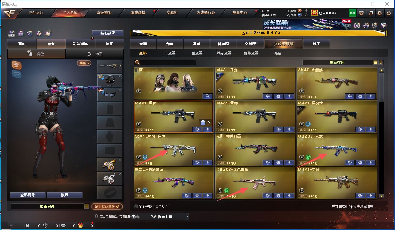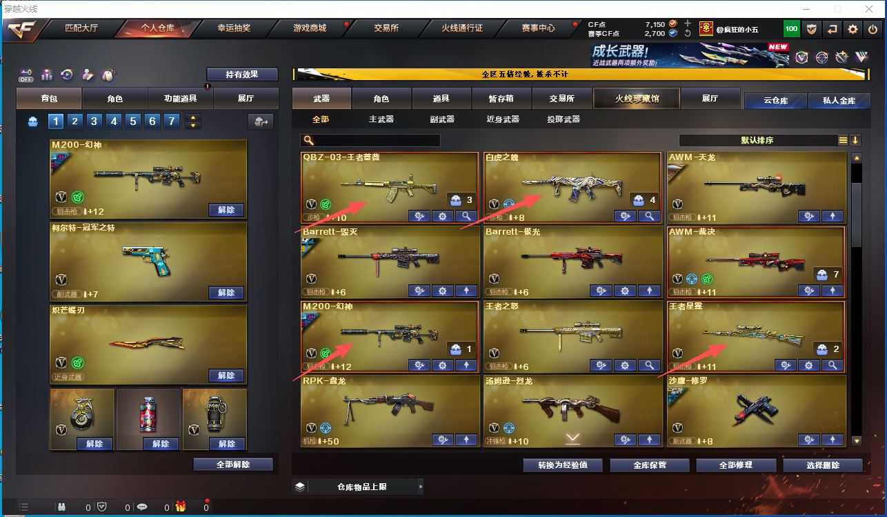 【m200幻神+荣耀世冠白鲨+冠军之特+炽芒蝶刃】【王者星霆+usp雷暴】【白虎+白虎音效卡+白虎之魄】【裁决+裁决音效卡】【雷神+雷神音效卡】【毁灭+荣耀之怒皮肤】【云龙套装】【qbz03金色蔷薇+王者蔷薇】【千变 火麒麟 雷神 黑骑士 无影神兵利器 黑武士锦绣游龙 猎神 天龙 毁灭 极光 裁决 盘龙 烈龙】——【热门武器/小人枪】【斯泰尔蝴蝶】【冠军之特 usp雷暴 cop云龙 修罗 王者之魂】【炽芒蝶刃 屠龙 龙啸 擎天 斩神刀雷暴 幻灵之峰】——【雷暴投掷套装*4】【幻灵投掷套装*3】【云龙投掷套装】——【角色】【葵】【暗夜审判】【潘多拉x】;USP-雷暴,柯尔特-冠军之特,炽芒蝶刃,RPK-盘龙,QBZ03-金色蔷薇,M200-幻神,Scar Light-白虎,
