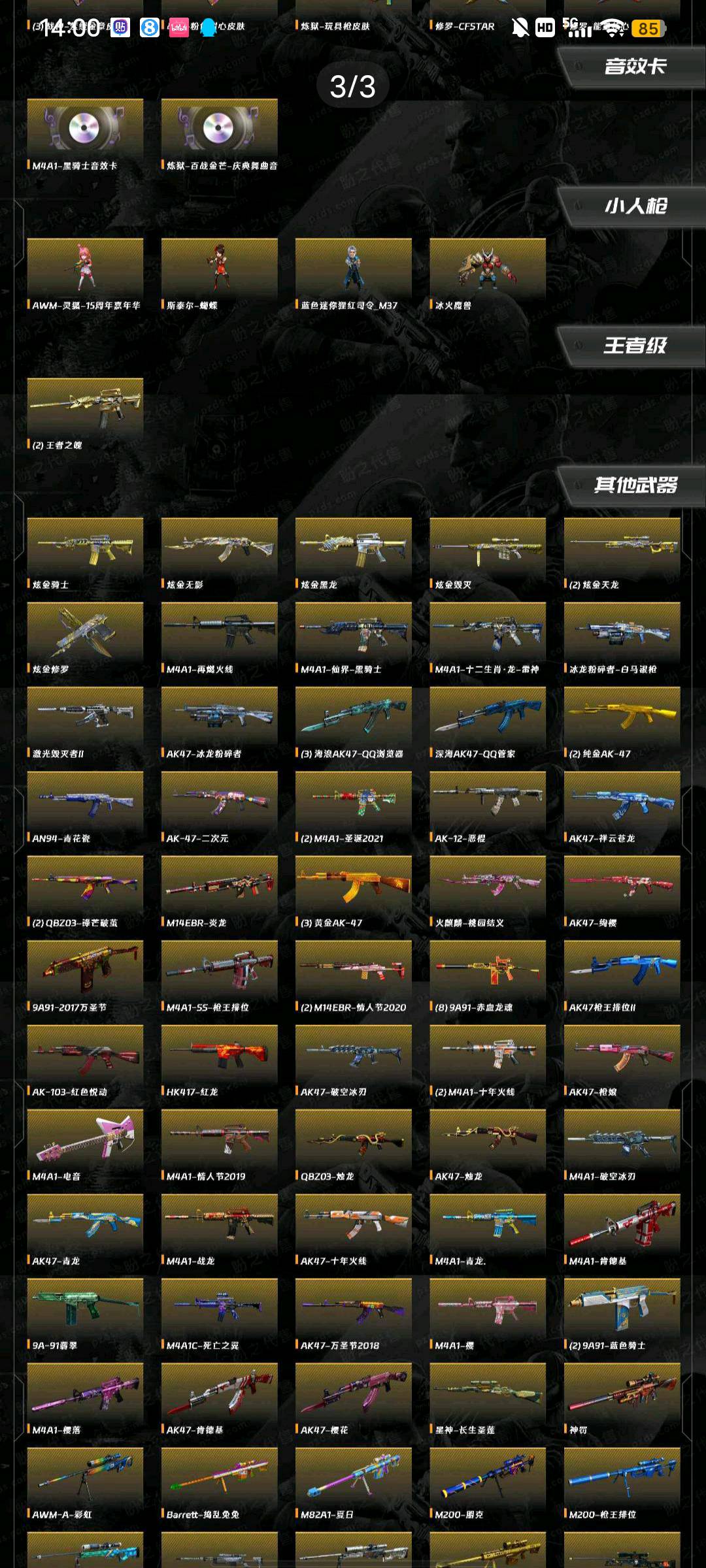 VIP4 114V,3王者,7炫金,毁灭星空/毁灭耀金/毁灭墨兰/极光能量核心/天龙CFSTAR/裁决运输船 /火麒麟CFSTAR/火麒麟平天大圣/AK47雷神/雷神能量核心/_葵/_瞳/Barrett-毁灭(2)/Barrett-极光/barrett-金色蔷薇/Barrett-暗月传说(2)/王者之光-觉醒版/雷暴套装/M4A1-黑骑士音效卡/炼狱-百战金芒-庆典舞曲音效;USP-雷暴,RPK-盘龙,QBZ03-金色蔷薇,