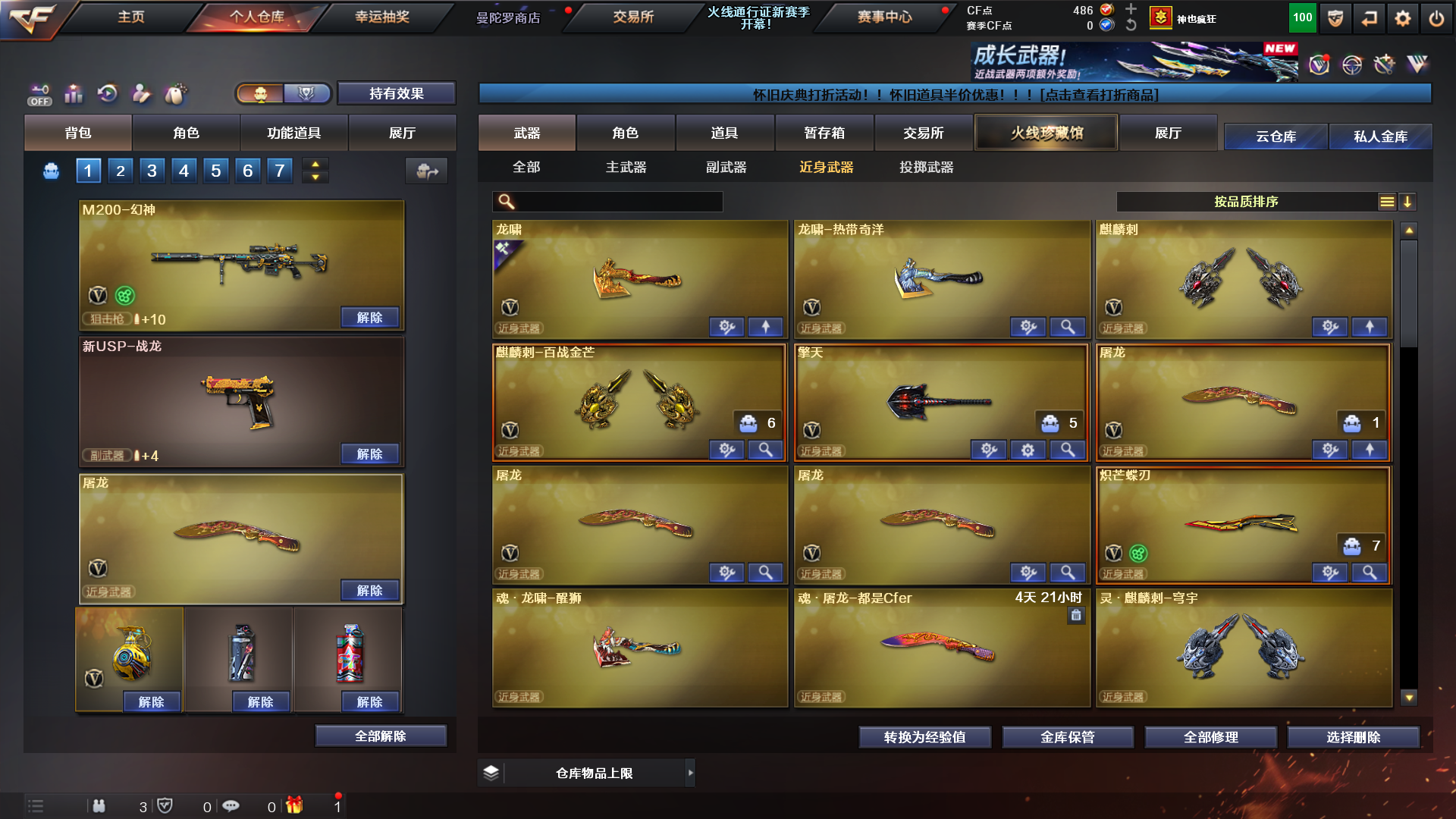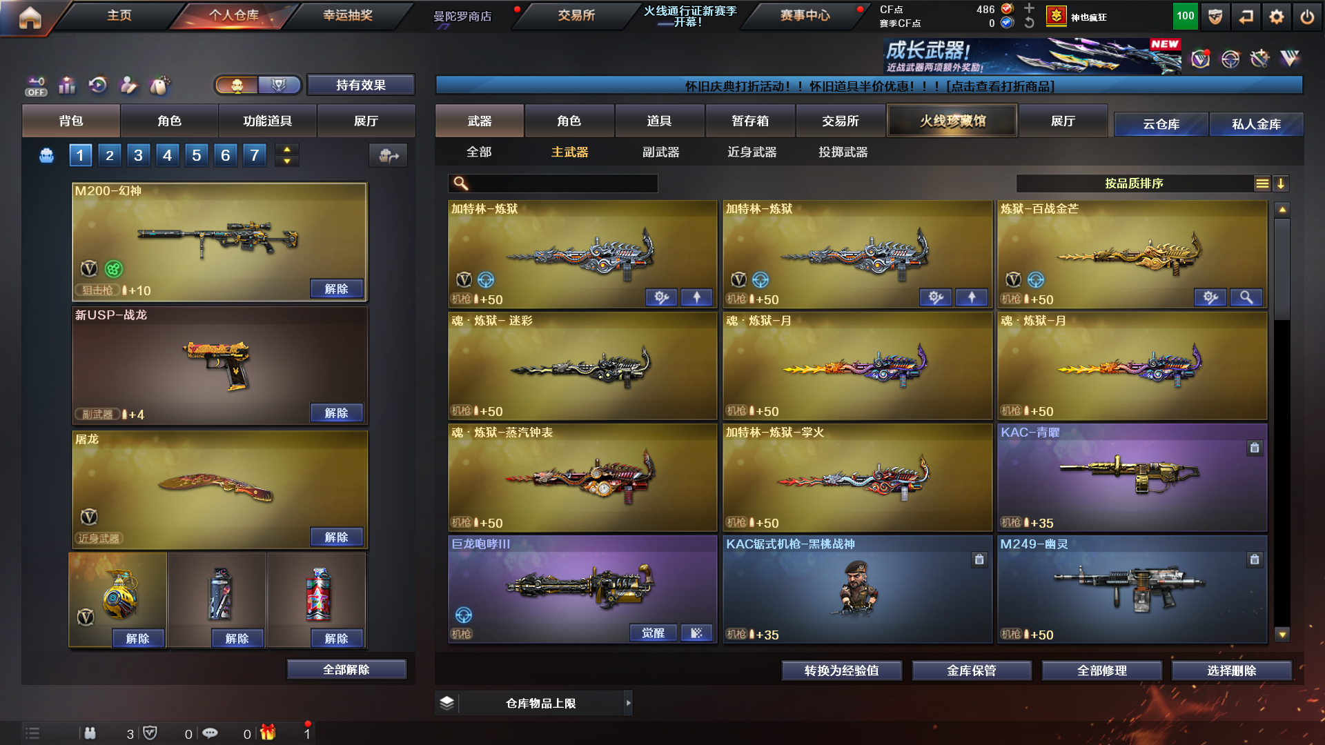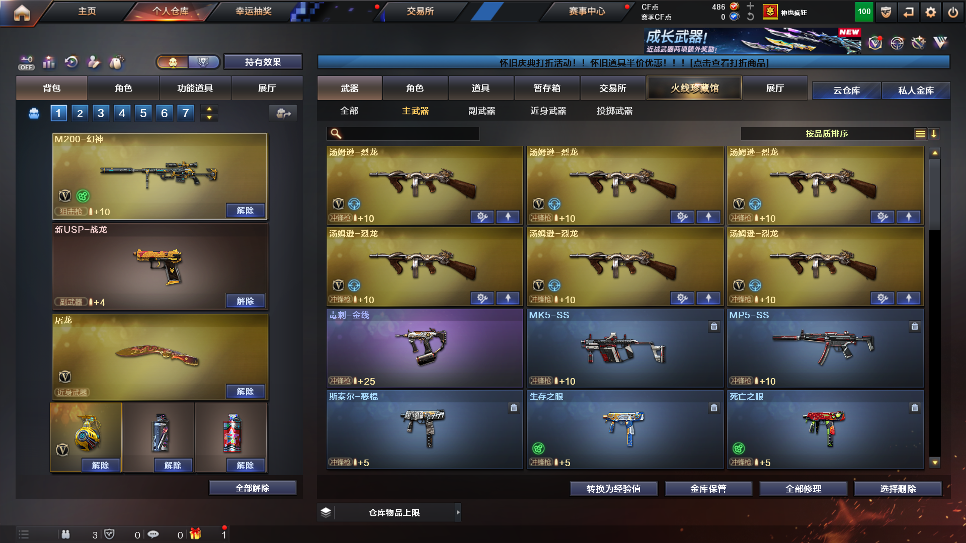 生化: 6烈+炽芒蝶刃+7生化手雷+3炼狱 爆破:幻神+电流骇客 /双觉醒王者之心+王者之怒 /王者之武 /王者之魂 /天启-悦智 /超新星-悦享 /炫金-修罗 /炫金雷神 /炫金黑龙 /毁灭+音效卡+皮 /雷神+4皮 /黑骑士 /黑龙 /无影 /9A91烈火 /雷霆 /猩红传说 /天启 /机械迷城 /黑武士 /超新星 /天龙 /裁决 /猎神 /玫瑰精灵 /死神-雪域霜狐 /修罗+5 /天神 /海王-黑骑士 /超新星-热带奇洋 /火麒麟+怀旧皮/3QBZ云龙+金色蔷薇+古影迷棕 /满怀旧武器(你想玩的都有) 角色:晴雅+零+樱+战地猎狐 道具:爆破全装/生化全装(6烈+3炼狱);炽芒蝶刃,晴雅,RPK-盘龙,QBZ03-金色蔷薇,M200-幻神,
