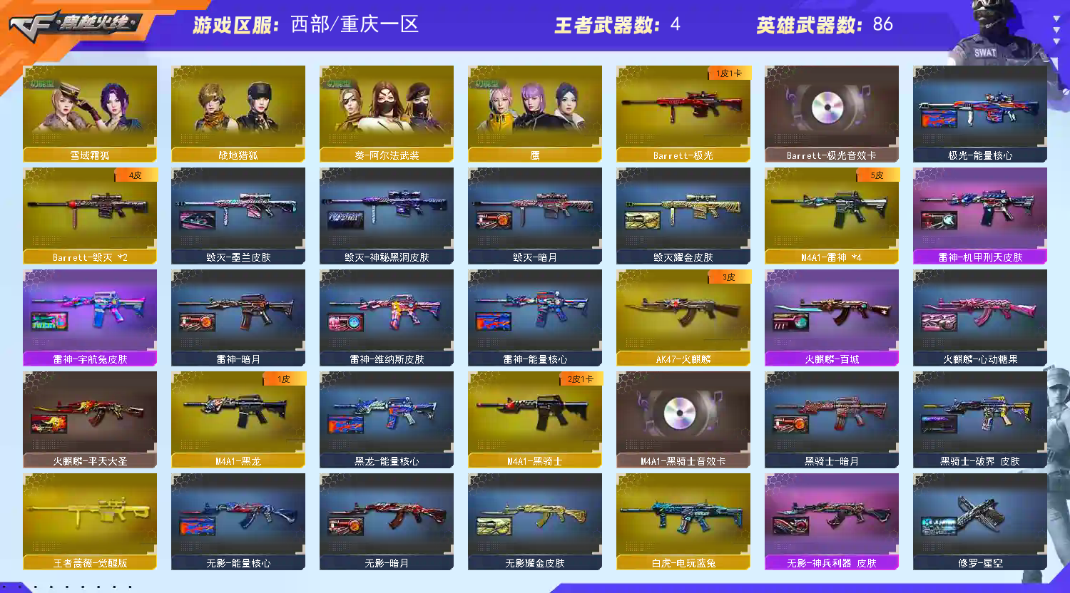 生化爆破全能✅四防毒蝰术士+6烈龙蝴蝶+6盘龙炼狱🔥幻神电流骇客+QBZ金色蔷薇🔥 西部战区合区大区(四川一区、四川二区、重庆一区、陕西一区、**南一区)登录的时候选择重庆一区。 【编号】:CQ292 【角 色】:毒蜂术士、樱、鹰、王者潘多拉、兔囡囡、风暴女、救世主-X、蜀雪、铁骑荣耀、影舞者-X、8周年戒指、双蛇戒指、双龙戒指 【主 武】:幻神(电流骇客)、6烈斯太尔蝴蝶、6盘炼狱、白虎电玩蓝兔、千变(孔明)、火麒麟(STAR)、黑龙(能量核心)、雷神X3(暗月、宇航兔)、黑骑士(暗月)、无影(耀金)、死神、黑武士、龙血、QB金色蔷薇、玫瑰精灵、天亮(秘银)、毁灭(耀金)、裁决、Barrett金色蔷薇、毁灭征服者、冰龙粉碎者、机甲撕裂者、激光毁灭者、圣炎切割者、深渊巨龙咆哮、神圣爆裂者、试炼破坏者、苍雷、金魔等各种活动武器 【副 武】:修罗X2(星空、STAR)、天神X4(宇航兔)、天神动感闪耀、修罗古蛇迷宗、阐释者、COP小青龙、胜利之火、大黄蜂 【近 身】:屠龙X2(彼岸花)、龙啸、擎天、麒麟刺、屠龙动感闪耀、擎天云海游龙、金刚伞、丛林匕首-枪王排位、猫猫手套、激光短刃、冰火魔拳 【投 掷】:迷你生化手雷、深渊终结者手雷、胜利之光、高爆手雷-雷蛇、高爆手雷-SS 【道 具】:黑骑士音效卡、三国蜀国玩偶、15周年玩偶、黄金幸运猪猪玩偶、14个背包、AC(防弹衣+防弹头盔)、C4工具钳、手雷包、挑战弹夹、夺命之镰、变异宝贝、灵魂忍者、生化弹夹、防化服、机枪弹夹、冲锋枪弹夹、散弹枪弹夹、手枪弹夹、狙击枪弹夹、步枪弹夹、减少停顿包;RPK-盘龙,QBZ03-金色蔷薇,M200-幻神,