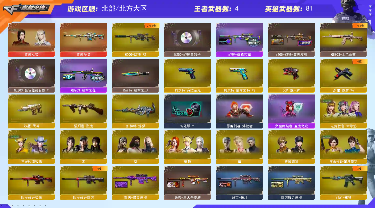 ★收藏好评! 由于异地登录保护机制,部分客户在使用客户端自动上号时会出现密码错误,注意本号密码不会错误,请多尝试5-6次!本账号已经过虚拟财产,请各位科技大神高抬贵手。请素质租号,文明游戏,谢谢大家配合!!!;柯尔特-冠军之特,Knife-冠军之刃,传说女帝,电竞教官-云悠悠,王者沙漠玫瑰,QBZ03-金色蔷薇,M200-幻神,