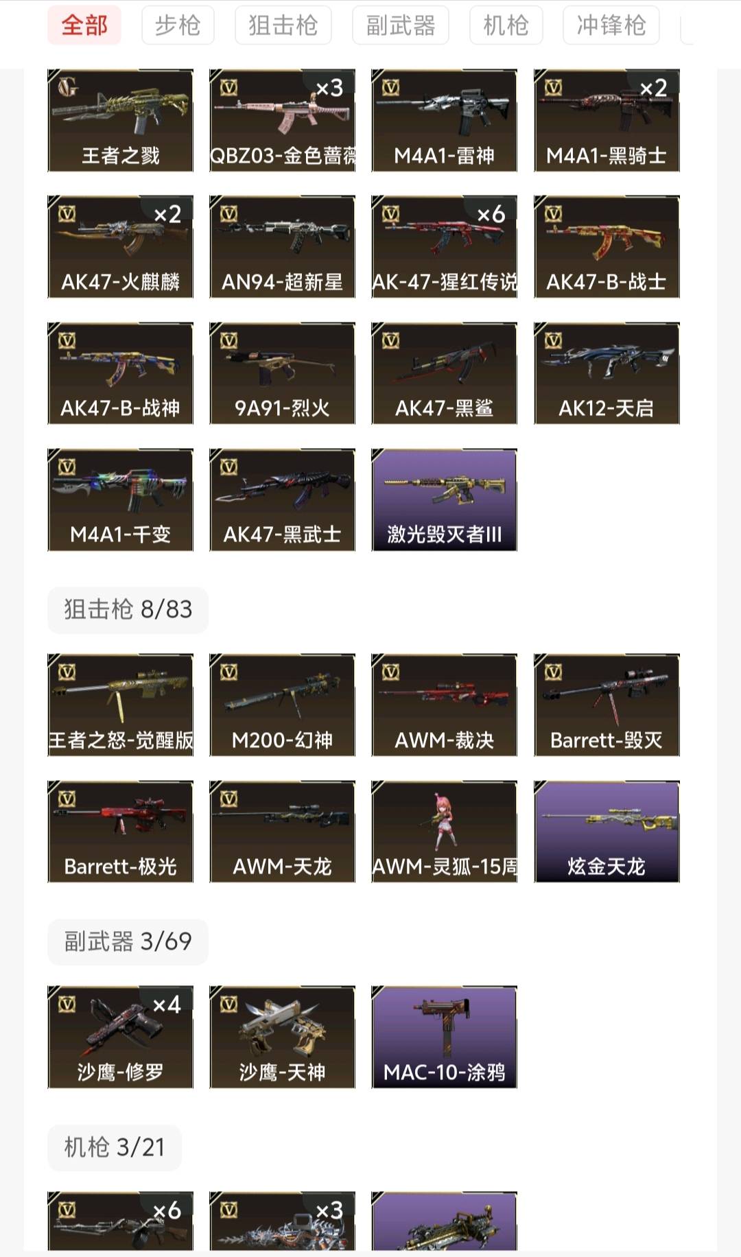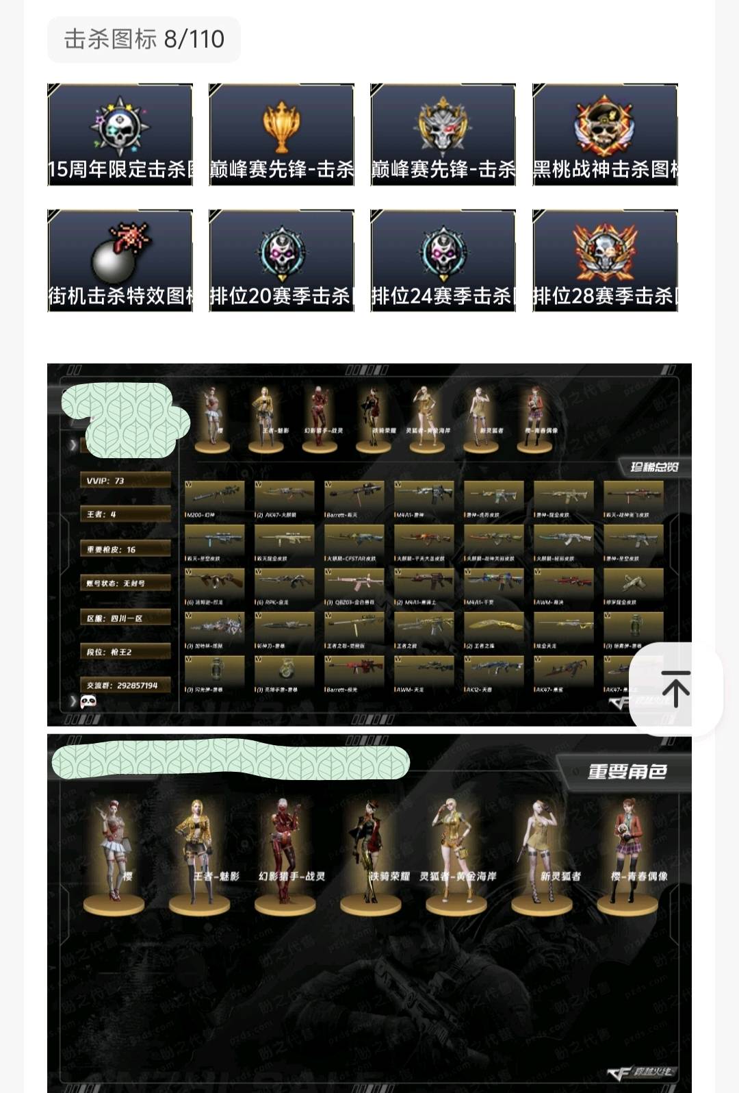 【Lv.102 荣耀元帅】 73V,4王者,1炫金,毁灭战神张飞/毁灭星空/毁灭耀金/火麒麟CFSTAR/火麒麟平天大圣/火麒麟战神关羽/火麒麟轻羽/千变孔明/雷神虎将/雷神耀金/_樱/M200-幻神/Barrett-毁灭/Barrett-极光/王者之怒-觉醒版/AWM-天龙/M4A1-黑骑士音效卡/Barrett-毁灭音效卡(截图展示段位不代表实际段位,如赛季更新等不可抗拒因素发生变化[重要角色]_樱/王者-魅影/幻影猎手-战灵/铁骑荣耀/灵狐者-黄金海岸/新灵狐者/樱-青春偶像[传说武器]六烈龙六盘龙 【英雄武器]_M200-幻神/Barrett-毁灭/Barrett-极光/王者之怒-觉醒版/AWM-天龙/AWM-裁决/M4A1-雷神/M4A1-干变/M4A1-黑骑士(2)/AK12-天启/AK47-火麒麟(2)/AK47-黑 鲨/AK47-黑武士/AK-47-猩红传说(6)/AK47-B-战士/AK47-B-战神/AN94-超新星/QBZ03-金色蔷薇(3)/9A91-烈火/RPK-盘龙(6)/汤姆逊-烈龙(6)/烈龙-悦心-觉醒版/加特林-炼狱(3)/沙鹰-天神/沙鹰-修罗(4)/麒麟刺(2)/龙啸(2)/擎天(9)/斩神刀-雷暴/高爆手雷-雷暴(3)/烟雾弹-雷暴(3)/闪光弹-雷暴(3)【王者武器]王者之戮/王者之锋(2) 【小人枪]AWM-灵狐-15周年嘉年华/斯泰尔-蝴蝶/魔能飞环-曼陀罗/迷你波特博士 [其他重要武器]炫金天龙/M4A1-十二生肖·龙-雷神/黑武士-能量核心/激光毁灭者III/M4A1-S-能量核心/M4A1-秘银赤龙(3)/M4A1-破空冰刃/黄金 AK-47/M4A1-XS-赤龙/Scar-Light-赤血龙魂 (5)/9A91-赤血龙魂(2)/AK47-十二生肖-蛇/AK47- SS-枪王排位/M200-牡丹/M82A1-水枪/M200-赤血龙魂/AWM-S/暗金AWM/凤凰之怒/暗金M200/巨龙咆哮川/KAC-赤烛/EVO III-赤血龙魂(5)/死亡之眼/Steyr TMP-CFS2020纪念版/斯太尔-能量核心/神圣爆裂者III/AA-12-圣龙/SPAS-12-雷电核心/Spas-12-黑金/愤怒公牛左轮-枪王排位(2)/.鹰-枪王排位(2)/新USP-枪王排位奖励(3)/USP-黑大圣/沙漠之鹰-A-摸金校尉/Cop357-赤龙/COP357-青龙/COP357--绚樱(2)/Anaconda-黑金神龙/COP357-十二生肖·羊/MAC-10-涂鸦/招财猫-枪王排位/蝴蝶刀-枪王排位/尼泊尔军刀-战龙/唐刀-九五至尊/丛林匕首-卧龙(3)/军用铁锹-赤龙/闪光弹-枪王排位/迷你生化手雷(2)/手雷-能量核心(2)/闪光弹-小乔 [重要武器皮肤]毁灭-战神张飞/毁灭-星空/毁灭耀金皮肤/火麒麟-CFSTAR/火麒麟-平天大圣/火麒麟-战神关羽/火麒麟-轻羽皮肤/M4A1-干变-孔明皮肤/雷神-虎将/雷神-耀金皮肤/雷神-星空/战神-流全出日皮肚/战神_些绶全音中肚/战神粉布甜心中金岁月皮肤/战神-紫绶金章皮肤/战神-粉色甜心皮肤/炼狱-玩具枪皮肤/修罗耀金皮肤 [重要光效】王者之怒金色光效/AWM-天龙绿色光效 [重要音效卡]M4A1-黑骑士音效卡/Barrett-毁灭音效卡 [重要戒指]15周年限定戒指/龙眼(死神)/银蛇戒/16赛季纪念戒指-枪王耀金/17赛季纪念戒指-耀银/18赛季纪念戒指-耀银/23赛季纪念戒指-耀铜(食指)/24赛季纪念戒指-耀银(拇指)/25赛季纪念戒指-耀铜(食指)/25赛季纪念戒指-耀铜(拇指) [拥有重要玩偶】;RPK-盘龙,QBZ03-金色蔷薇,M200-幻神,