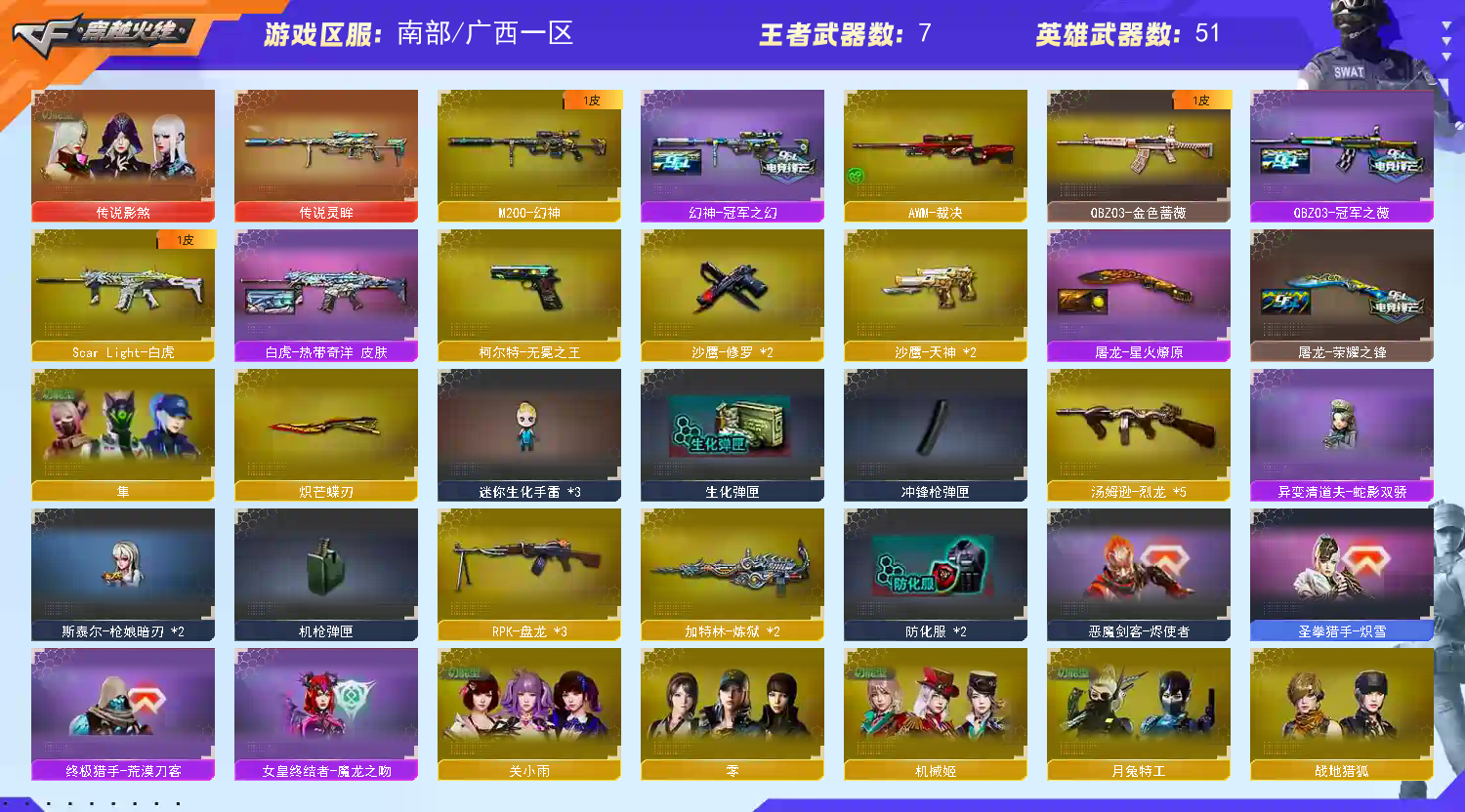 生化为主,爆破也够用,随意排位不禁言;柯尔特-无冕之王,炽芒蝶刃,传说影煞,隼,RPK-盘龙,QBZ03-金色蔷薇,M200-幻神,