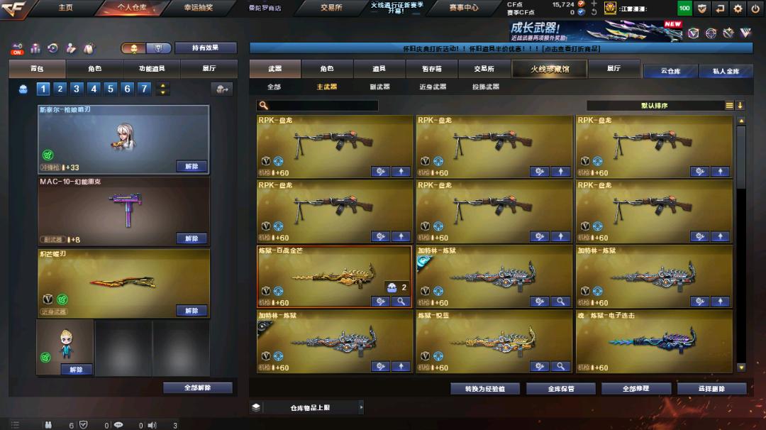 爆破生化号,四防隼qbz,36c幻影白虎雷暴,朱雀,烈火,炽芒蝶刃麒麟刺,小人枪,6烈7盘斯太尔枪娘,加特林夏佐皮肤,异变清道夫,全生化道具卡弹夹,极光火麒麟黑骑士音效卡;USP-雷暴,柯尔特-无冕之王,炽芒蝶刃,隼,RPK-盘龙,QBZ03-金色蔷薇,G36C-幻影,