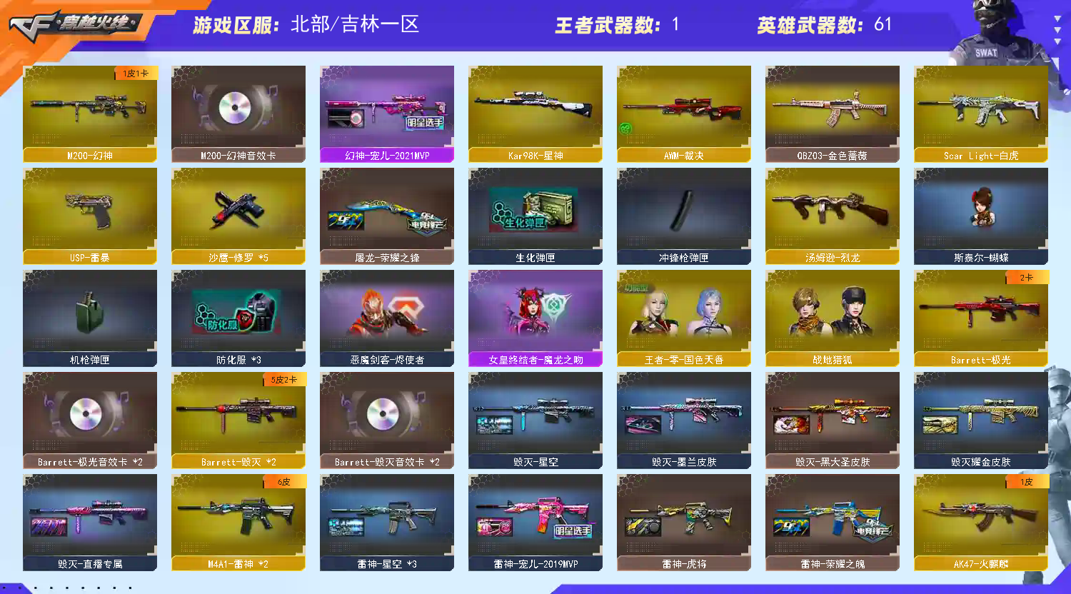 【稀有武器】:M200-幻神/Kar98K-星神/ScarLight-白虎/HK417-朱雀/USP-雷暴/天神-动感闪耀/QBZ03-金色蔷薇/AK47-火麒麟/M4A1-雷神(2)/M4A1-黑骑士/Barrett-毁灭(2)/Barrett-极光/AWM-裁决/汤姆逊-烈龙/斩神刀-雷暴/幻灵之锋 【王者武器】:QBZ-03-王者蔷薇-觉醒版 【热门角色】:奇洋探员/乔伊教练/潘多拉-X/潘多拉 【热门音效卡】:M200-幻神音效卡/Barrett-毁灭音效卡(2)/Barrett-极光音效卡(2) 【热门皮肤】:幻神-宠儿-2021MVP/毁灭-直播专属/雷神-宠儿-2019MVP/屠龙-荣耀之锋/雷神-荣耀之魄 【其他亮点】:斯泰尔-蝴蝶/金色蔷薇-空/贝雷塔687-射手座/烟雾弹-荣耀世冠白鲨2023(2);USP-雷暴,QBZ03-金色蔷薇,M200-幻神,Scar Light-白虎,Kar98K-星神,