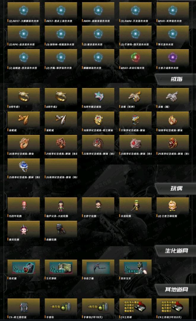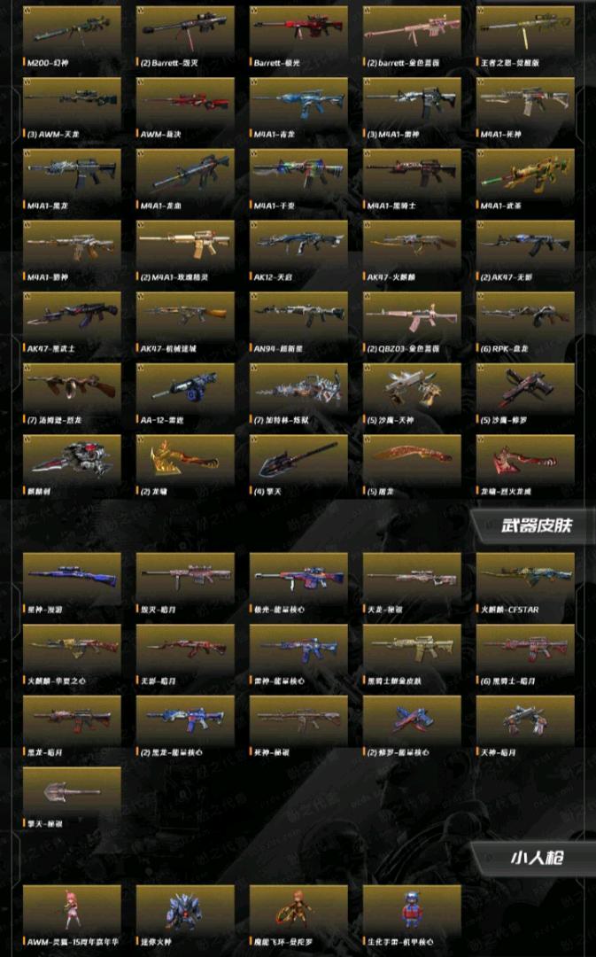 四防角色王者魅影。幻神七烈龙七盘龙七加特林炼狱足够了爆破生化齐全。vvip除了9a91烈火和黑鲨木有其他都有;RPK-盘龙,QBZ03-金色蔷薇,M200-幻神,