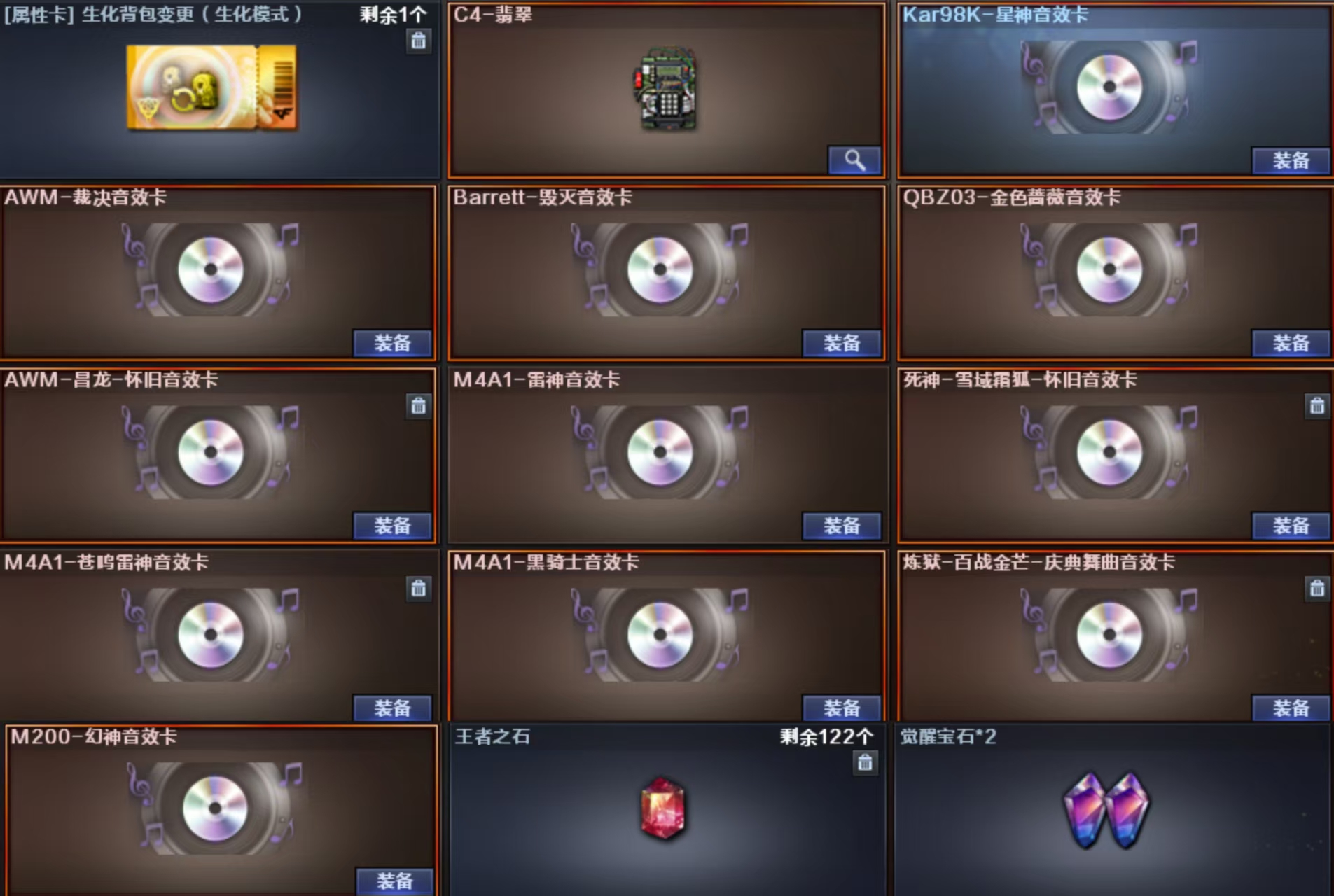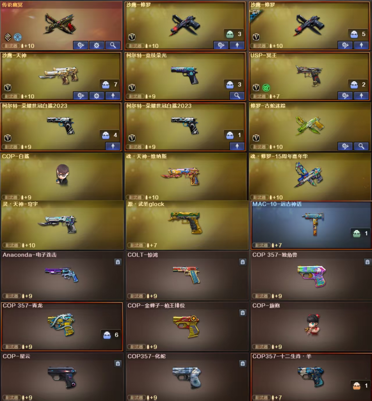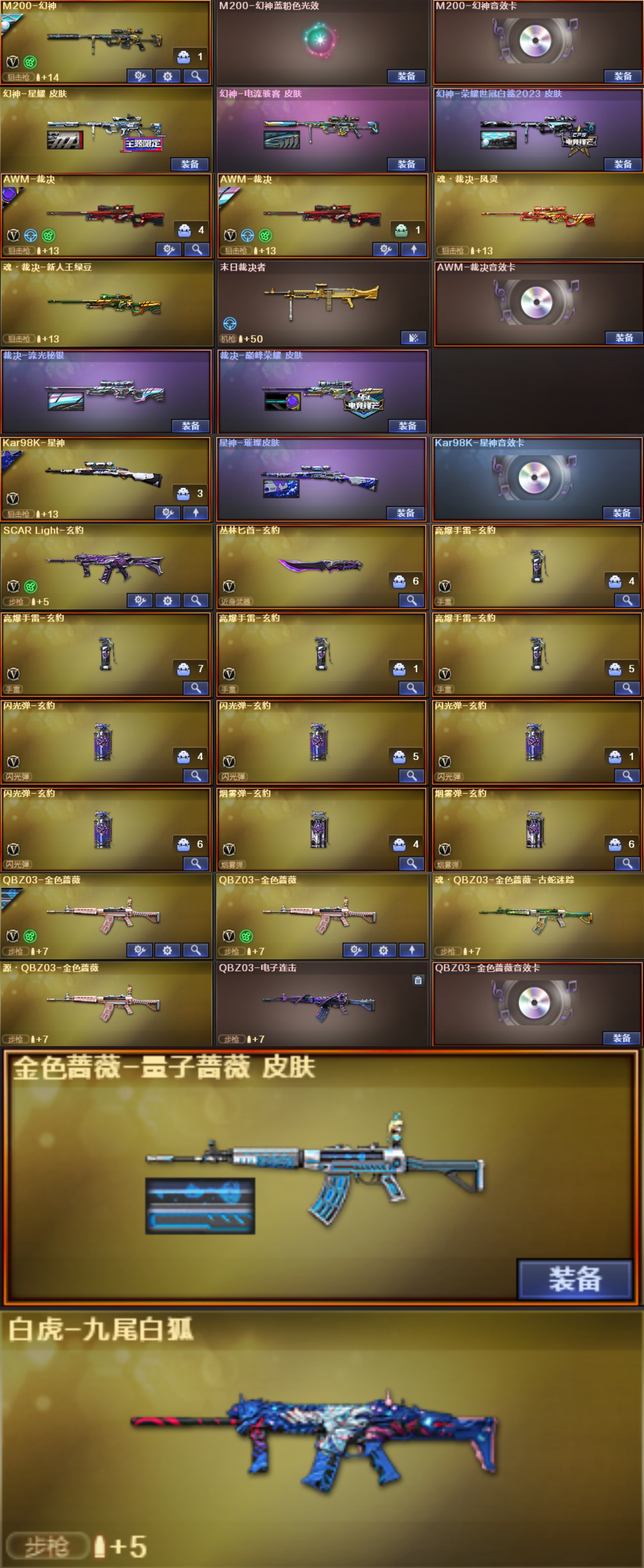 【王者武器】:【烟雾弹-雷暴王者-1,王者风势-觉醒版-1,盘龙-悦心-觉醒版-1,王者雷影-1,王者星光-1】 【英雄武器】:【AK12-天启-2,AN94-超新星-1,M4A1-黑骑士-1,屠龙-4,麒麟刺-1,AK47-火麒麟-2,AWM-天龙-1,Barrett-毁灭-1,汤姆逊-烈龙-5,沙鹰-修罗-2,加特林-炼狱-1,沙鹰-天神-1,M4A1-雷神-2,M4A1-黑龙-1,9A91-烈火-1,M200-幻神-1,M200-竞技荣光-1,擎天-竞技荣光-1,机械迷城-穹宇-1,柯尔特-竞技荣光-1,烟雾弹-竞技荣光-2,闪光弹-竞技荣光-3,高爆手雷-竞技荣光-2,炽芒蝶刃-1,AA-12-雷霆-1,Barrett-暗月传说-1,QBZ03-金色蔷薇-2,SCAR Light-玄豹-1,丛林匕首-玄豹-1,Barrett-碧霄极光-1,USP-冥王-1,高爆手雷-玄豹-4,闪光弹-玄豹-4,烟雾弹-玄豹-3,传说幽瞳-1,G36C-幻影-1,传说幽冥-1,柯尔特-荣耀世冠白鲨2023-2,Kar98K-星神-1,擎天-2,AWM-裁决-2,传说圣谕-1,龙啸-烈火龙威-1,AK47-B-战神-1】 【装饰品】:【火麒麟-CF STAR-1,天龙-CF STAR-1,修罗-CF STAR-1,毁灭-暗月-1,中国娃玩偶-1,兔子泰迪娃娃-1,击杀图标-恶灵-1,击杀图标-万圣-1,AWM-天龙-传奇白鲨-1,幻神-荣耀世冠白鲨2023 皮肤-1,AK47-火麒麟-传奇EVEN-1,传奇石头-横秒之巅-1,曼陀罗玩偶-1,毁灭-定军扬威 皮肤-1,毁灭-黑曼巴 皮肤-1,屠龙-星耀 皮肤-1,幻神-星耀 皮肤-1,击杀图标-16周年限定-1,星神-璀璨皮肤-1,炼狱-星空-1,裁决-流光秘银-1,金色蔷薇-量子蔷薇 皮肤-1,魅影玩偶-1,裁决-巅峰荣耀 皮肤-1,雷神-传奇N9-1,白泽玩偶-1】 【角色】:【堕天使,猎狐者,刀锋,活力灵狐,潘多拉-锋芒精英,毒蝎-X,关小雨,电竞教官-云悠悠,影武者-X,救世主-X,剑齿虎-X,猎狐者-X,研,狐妖儿,星际战将,玄豹,娜塔莎】 【道具】:【超级背包-1,金蛇戒-1,银蛇戒-1,烟雾保护头盔-1,猫耳头盔-1,防弹衣-1,防弹头盔-1,手雷包-1,C4工具钳-1,防化服-1,夺命之镰-1,变异宝贝-1,灵魂忍者-1,妖姬-1,疯狂宝贝-1,迷雾幽灵-1,步枪弹匣-1,冲锋枪弹匣-1,云螭玩偶-1,魔法帽子-1,Barrett-毁灭音效卡-1,M4A1-雷神音效卡-1,炫彩背包-诺拉-1,M4A1-黑骑士音效卡-1,M200-幻神音效卡-1,云山科技背包-1,听风战术耳机-1,智眸战术目镜-1,弦波科技无线电-1,泉枢动力水壶-1,元界战术腿袋-1,运动护目镜-破浪十年-1,QBZ03-金色蔷薇音效卡-1,背包-洛丽塔-1,绿色巨人-1,兔子发带-1,Kar98K-星神音效卡-1,超级护目镜-1,AWM-裁决音效卡-1】;柯尔特-荣耀世冠白鲨2023,传说幽冥,炽芒蝶刃,电竞教官-云悠悠,QBZ03-金色蔷薇,传说幽瞳,G36C-幻影,