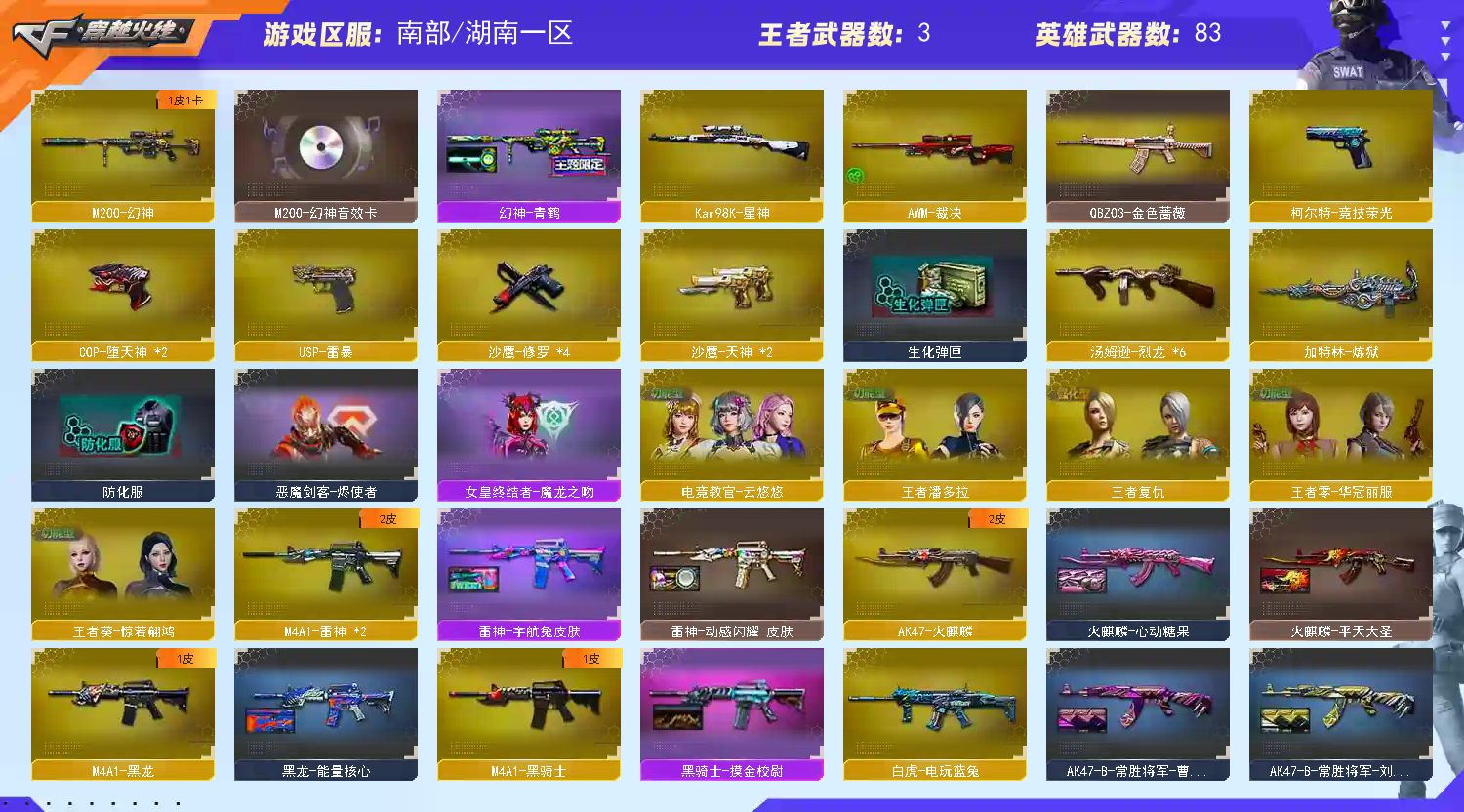 幻神+幻神音效卡✨USP雷暴✨星神✨竞技荣光套✨堕天神套✨金色蔷薇白虎蓝兔6烈龙✨4个四防角色【荣耀之巅87豆】【Lv.102 荣耀元帅】VIP6 87V 5王者 幻神青鹤/毁灭魔灵/火麒麟平天大圣/火麒麟心动糖果/刘备/孙权/曹操/雷神动感闪耀 /雷神宇航兔/黑骑士摸金校尉/电竞教官-云悠悠/蛇姬/M200-幻神/M200-竞技荣光/Barrett-暗月传说(2)/Kar98K-星神/AWM-裁决/堕天神套装/竞技荣光套装/M200-幻神音效卡;