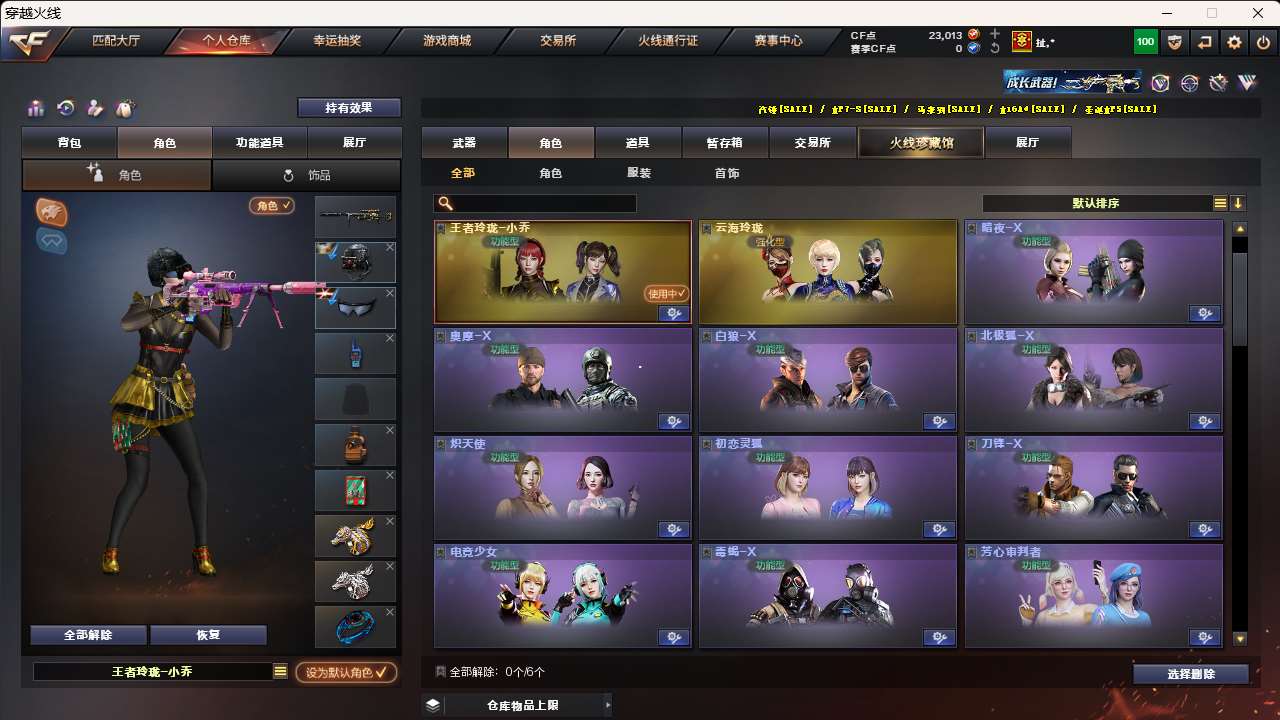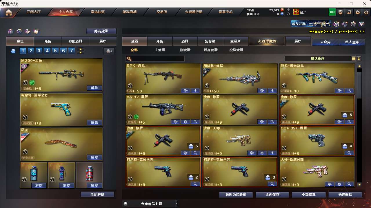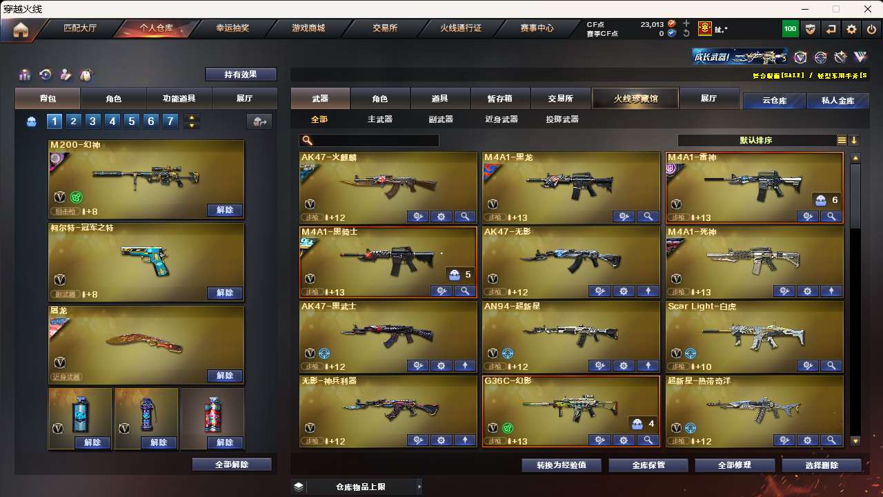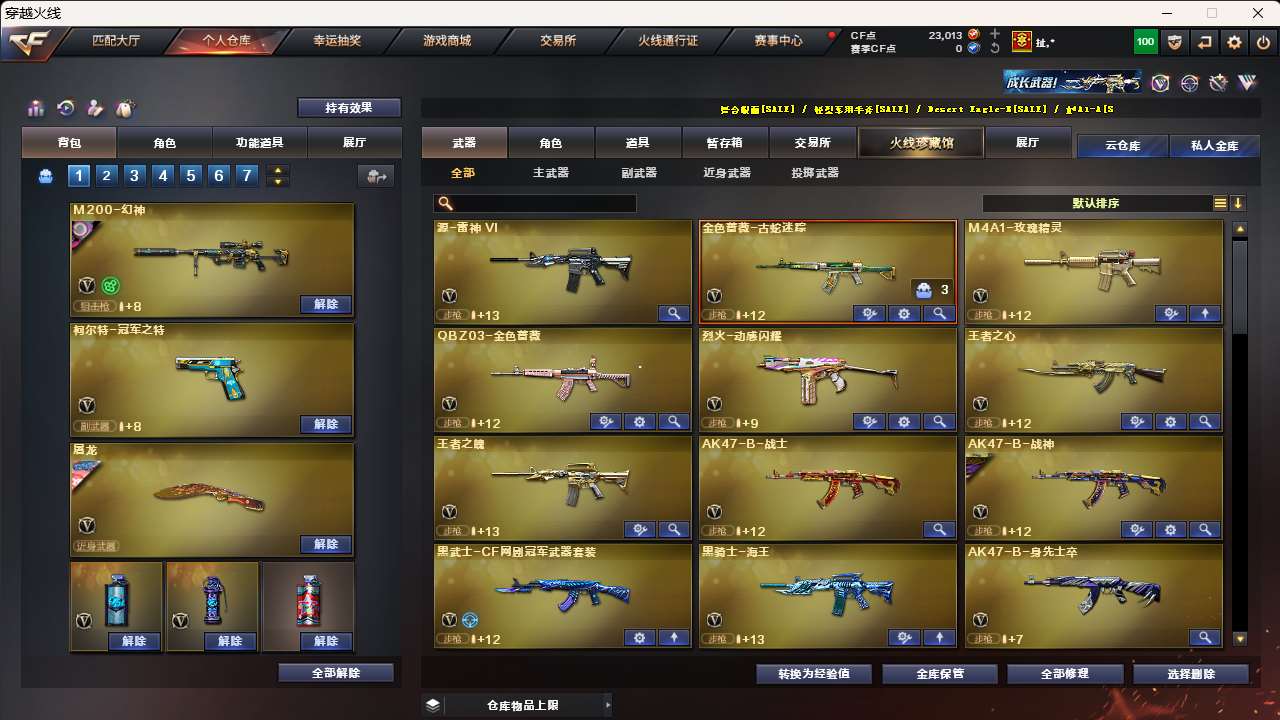 【m200-幻神 幻神-宠儿-2021mvp 幻神-cfs2022 幻神-电流骇客】➕【王者风神】➕【kar98k-星神】➕【m200-竞技荣光套装】➕【g36c-幻影】➕【scar light-白虎】➕【qbz03-金色蔷薇 王者芳薇】➕【柯尔特-竞技荣光*2 柯尔特-冠军之特 cop-雷霆】➕【角色:(四防)王者玲珑-小乔 (四防)王者-魅影 电竞教官-云悠悠 关小雨 机械姬 隼 樱 蛇隐宗 审判者 葵 奇洋探员 乔伊教练 云海玲珑】➕【王者芳薇 王者风神 王者之魄 王者之心王者之幻 王者之刺*2】➕【炫金炫金武士 炫金骑士*2】➕【皮肤:黑骑士-冠军之势 雷神-冠军之魄 毁灭-冠军之怒 龙啸-冠军之啸 雷神-r.lgd-cfpls18冠军】➕【火麒麟 黑龙 雷神 黑骑士 无影 死神 黑武士 超新星 神兵利器 热带奇洋 源-雷神 古蛇迷踪 玫瑰精灵 烈火-动感闪耀 战士 战神 cf网剧冠军套装 黑骑士-海王 身先士卒 常胜将军 天龙 毁灭 裁决 4盘龙 2炼狱 雷霆 烈龙-云海游龙】➕【11副武器 15近身武器】➕【竞技荣光投掷武器套装*7】➕夺命之镰 防化服 c4工具钳 手雷包;柯尔特-冠军之特,隼,电竞教官-云悠悠,RPK-盘龙,QBZ03-金色蔷薇,G36C-幻影,M200-幻神,