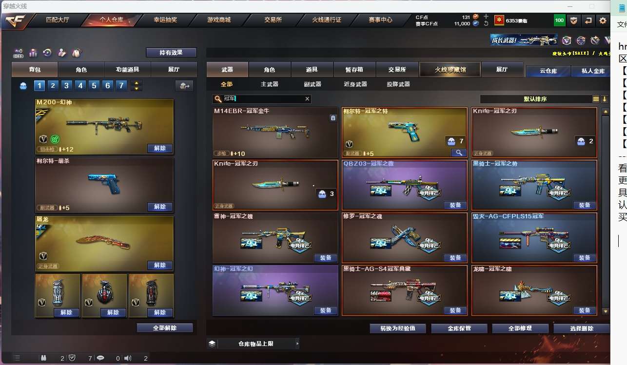 【亮点解析 幻神5皮带卡 冠军套 】【m200幻神+音效卡+周瑜+宠儿+n9皮肤+荣耀世冠白鲨+冠军之幻+冠军之特+冠军之刃*2】【王者幻神】【王者星霆】【qbz金色蔷薇+卡+冠军之薇+巅峰荣耀+荣耀世冠白鲨】【hk417朱雀】【火麒麟+巅峰荣耀+even】【雷神+巅峰荣耀+冠军之魄+宠儿+十周年+n9皮肤】【黑骑士*4+卡+冠军之势】【毁灭+卡+ag15冠军+cfs2018】【裁决】【炽芒蝶刃】 【武器:武圣 夜魔 王者之心 天龙 炼狱 烈龙 】 【8手呛:修罗*4 天神 夜魔*2 usp冥王 冠军之特】 【9刀具:屠龙*3 龙啸*2 擎天 麒麟刺 夜魔 】 【7雷套:夜魔雷*7】 【小人呛:cop白鲨 】 【音效卡:幻神音效卡 金色蔷薇音效卡 黑骑士音效卡 毁灭音效卡 】 【角色:凌霄 魅影 奇洋探员 王者瞳闭月羞花 】;柯尔特-冠军之特,炽芒蝶刃,Knife-冠军之刃,QBZ03-金色蔷薇,M200-幻神,