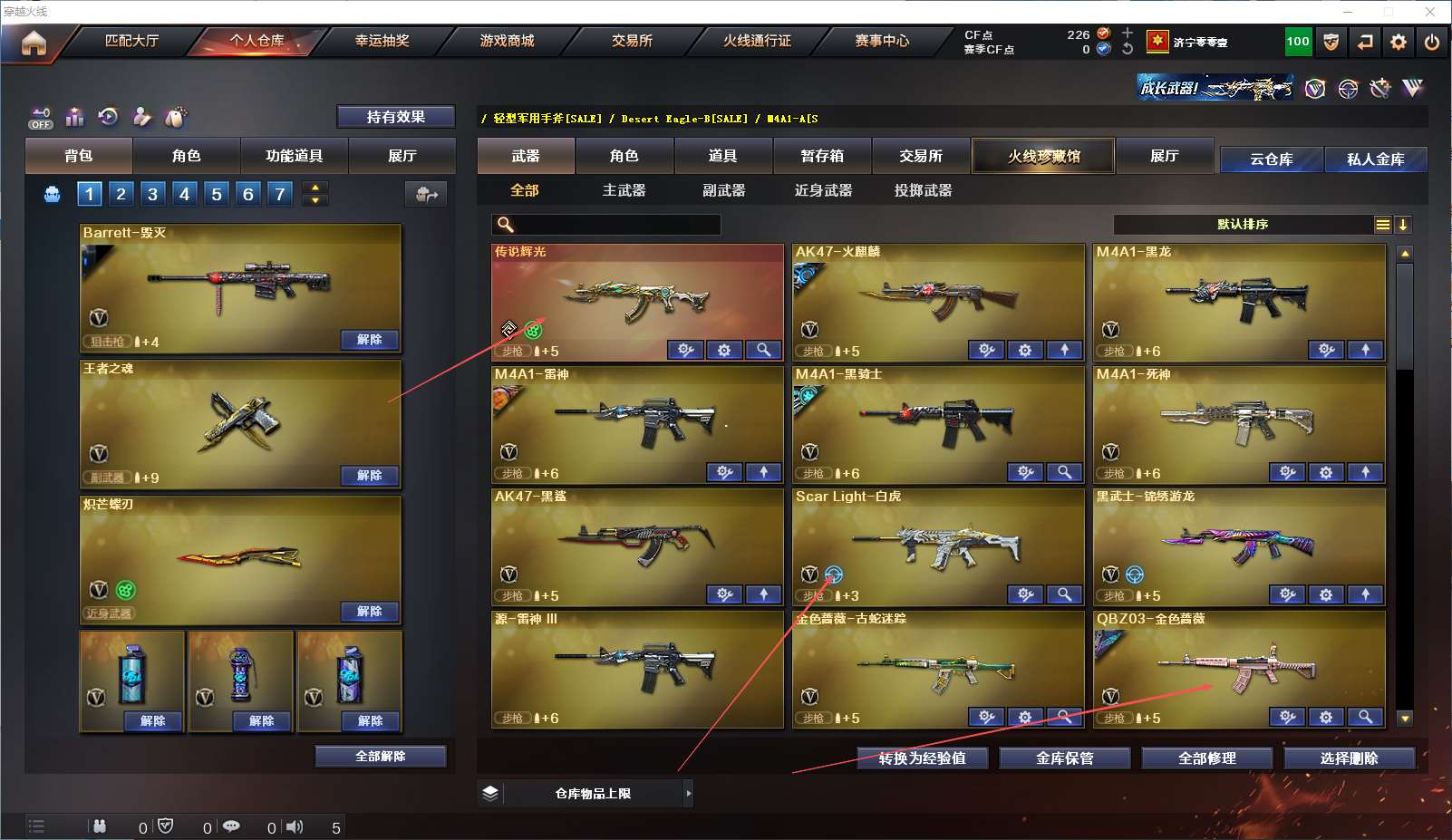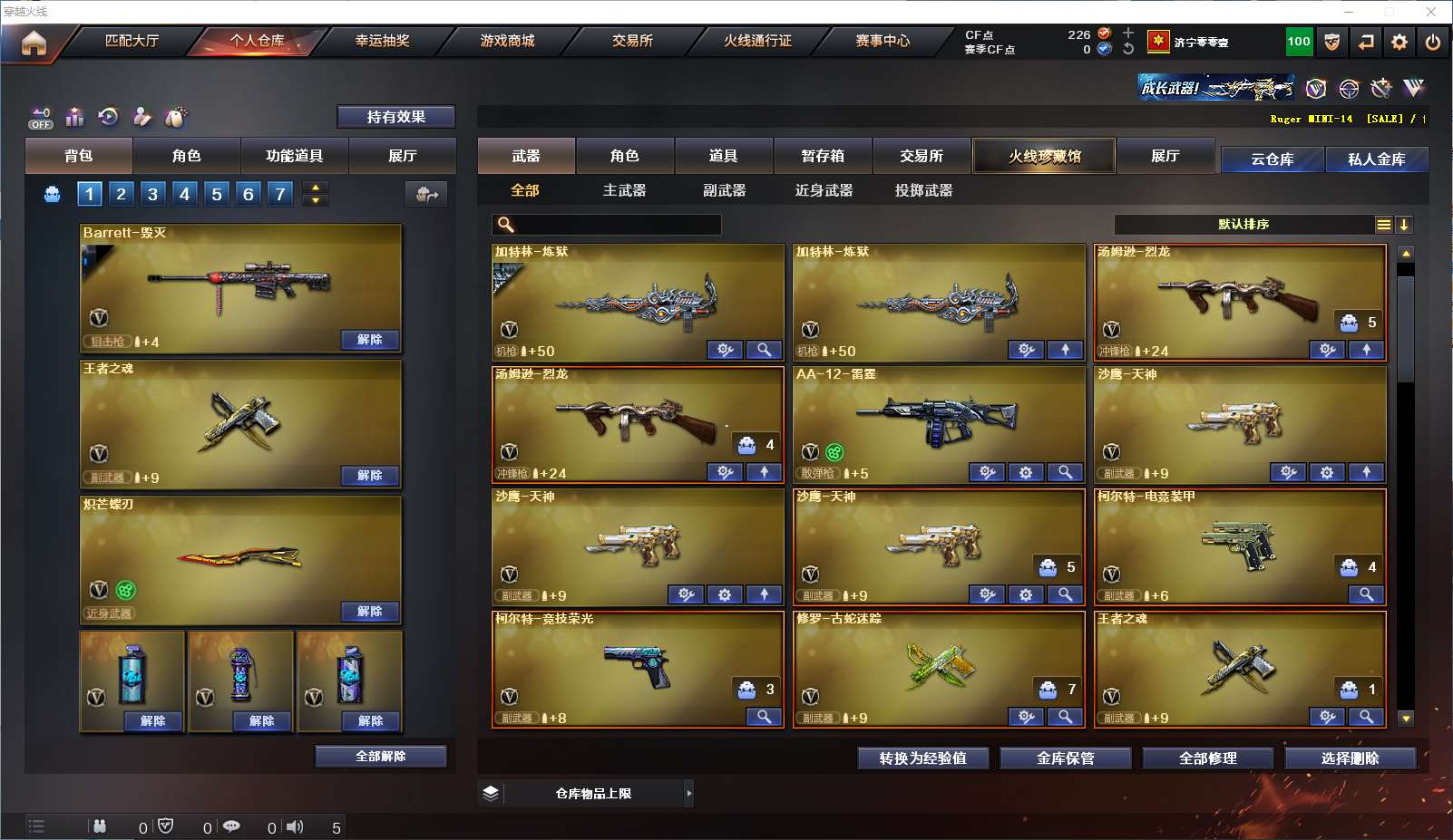 【幻神+幻神音效卡+冠军之特+炽芒蝶刃】 【竞技荣光套装】【白虎】【qbz03金色蔷薇+破浪逐光皮肤】【王者之影 王者猎神 王者之势】【2烈龙+2炼狱+盘龙】【火麒麟+火麒麟音效卡】 【雷神+雷神音效卡】 【黑龙+黑龙音效卡】 【毁灭+毁灭音效卡】 【死神 黑鲨 黑武士锦绣游龙 源雷神iii 金色蔷薇古蛇迷踪 烈火 猩红传说 战士 战神 身先士卒 常胜将军 白虎电玩蓝兔 天龙 极光 裁决 芭蕾特暗月传说 雷霆】——【冠军之特 沙鹰天神 柯尔特电竞装甲 柯尔特竞技荣光 修罗古蛇迷踪 王者之魂】——【炽芒蝶刃 屠龙 擎天 麒麟刺 麒麟刺堕天神 擎天竞技荣光 王者之啸 王者之击 龙啸烈火龙威】——【堕天神投掷武器套装 电竞装甲投掷武器套装 竞技荣光投掷武器套装】——【热门武器/小人呛】【朱雀蛇隐宗 雷神精英刀锋 火麒麟灵狐 雷神小红 马呛 黄金猫猫手套白鲨】——【角色】【4防王者魅影】【云悠悠 机械姬 蛇隐宗】;柯尔特-冠军之特,炽芒蝶刃,电竞教官-云悠悠,RPK-盘龙,QBZ03-金色蔷薇,M200-幻神,Scar Light-白虎,