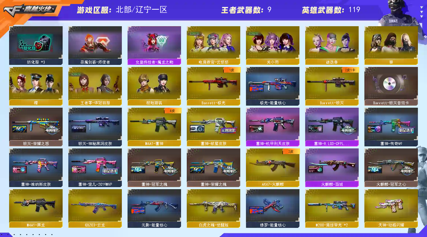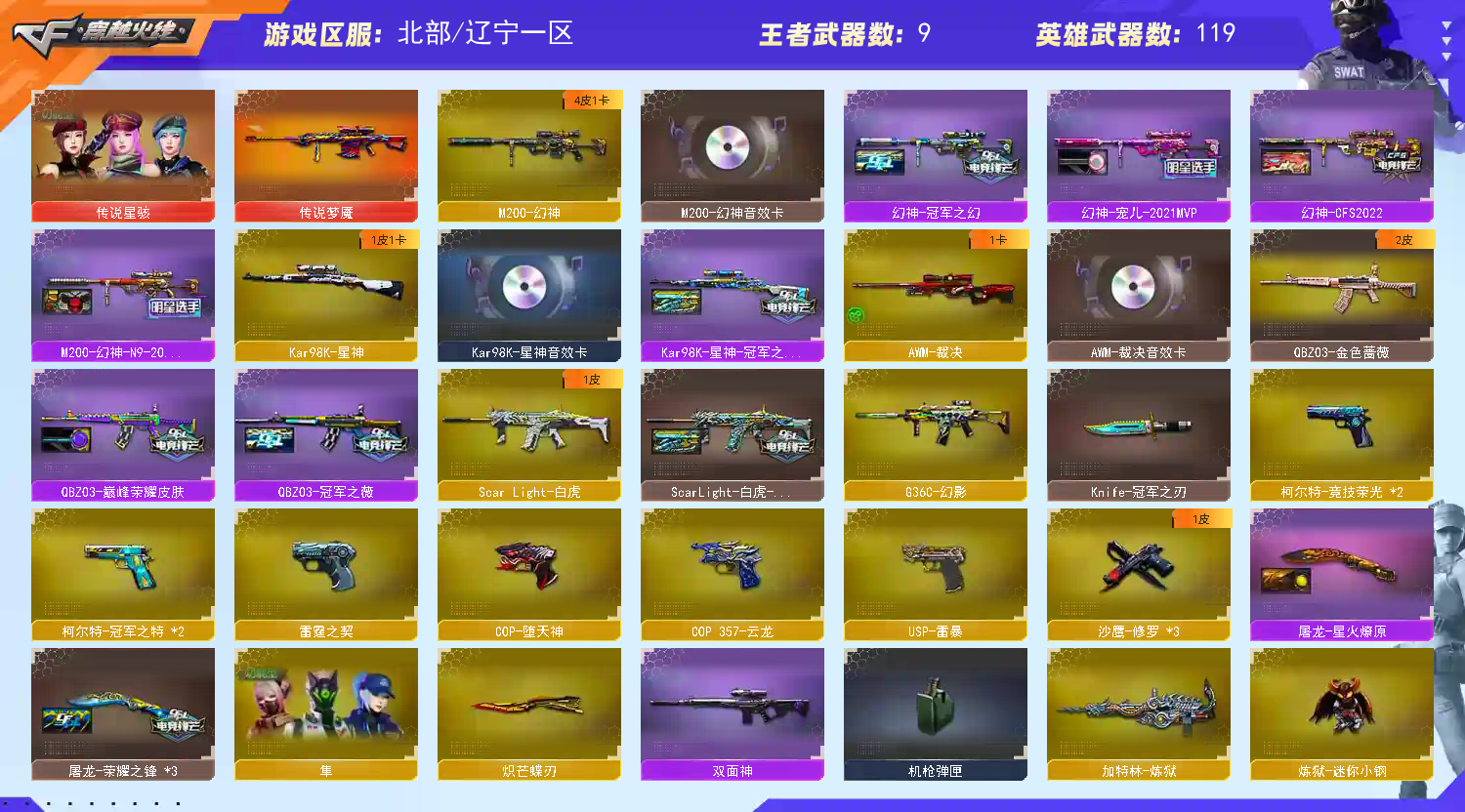 稀有武器】:传说梦魇/M200-幻神/Kar98K-星神/G36C-幻影/ScarLight-白虎/HK417-朱雀/雷霆之契/USP-雷暴/COP-堕天神/柯尔特-竞技荣光(2)/天神-动感闪耀/COP357-云龙/柯尔特-冠军之特(2)/QBZ03-云龙/QBZ03-金色蔷薇/AK47-火麒麟/M4A1-黑龙/M4A1-雷神/AK47-无影/Barrett-毁灭/Barrett-极光/AWM-裁决/M200-竞技荣光(2)/加特林-炼狱/炽芒蝶刃/麒麟刺-堕天神(2)/龙啸-堕天神/马来剑-夜魔/擎天-竞技荣光(4)/云龙扇 【王者武器】:白虎之魄-觉醒版/王者之光-觉醒版/王者之怒 【热门角色】:电竞教官-云悠悠/关小雨/迷迭香/隼/奇洋探员/乔伊教练/潘多拉-X/幽/潘多拉 【热门音效卡】:M200-幻神音效卡/Kar98K-星神音效卡/AWM-裁决音效卡/HK417-朱雀音效卡/Barrett-毁灭音效卡 【热门皮肤】:M200-幻神-N9-2022MVP/幻神-宠儿-2021MVP/幻神-冠军之幻/幻神-CFS2022/屠龙-星火燎原/QBZ03-巅峰荣耀皮肤/Kar98K-星神-冠军之星皮肤/雷神-R.LGD-CFPLS18冠军/QBZ03-冠军之薇/雷神-宠儿-2019MVP/雷神-传奇N9/ScarLight-白虎-冠军之虎皮肤/火麒麟-冠军之心/屠龙-荣耀之锋(3)/毁灭-荣耀之怒/雷神-冠军之魄/雷神-荣耀之魄 【其他亮点】:炼狱-迷你小钢/Knife-冠军之刃/Scar Light-马枪/贝雷塔687-射手座;USP-雷暴,柯尔特-冠军之特,炽芒蝶刃,Knife-冠军之刃,传说星骇,隼,电竞教官-云悠悠,