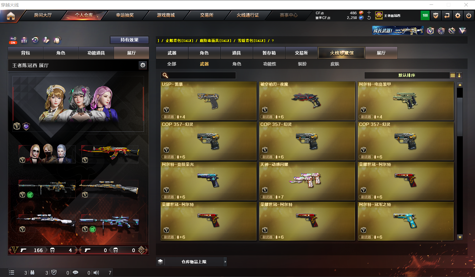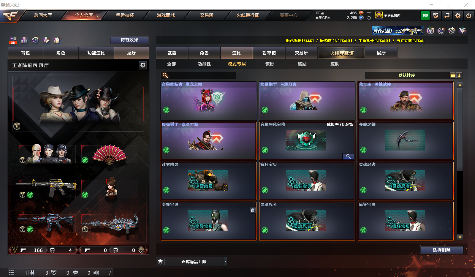 角色:4防沙漠玫瑰 四防影豹 4防凌霄 王者魅影 皮肤:终极猎手-秦魂将军和荒漠刀客 救世主-黑桃战神 女皇终结者-魔龙之吻 武器: 6盘龙 6烈龙 幻神 星神 王者星神 加特林-炼狱 斯泰尔-蝴蝶 MAC-10-涂鸦 轻型军用手斧镜 迷你生化手雷*3 套装4 幻灵全套 夜魔全套 竞技荣光全套 电竞装甲全套 道具:机枪弹夹 冲锋枪弹夹 生化弹夹 防化服 超级对讲机 变异宝贝 夺命之镰 防弹衣 防弹头盔;USP-雷暴,荣耀世冠-柯尔特,柯尔特-冠军之特,炽芒蝶刃,Knife-冠军之刃,沙漠玫瑰,电竞教官-云悠悠,