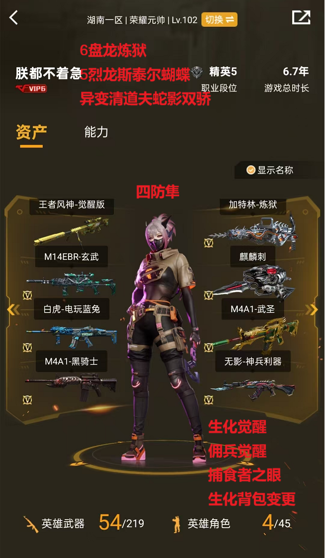 编号:HNN348南部湖南一区✅生化爆破号🔥四防隼+6盘龙炼狱🔥5烈龙异变清道夫蛇影双骄🔥M14玄武+白虎电玩蓝兔🔥 稀有武器:盘龙X6、烈龙X5、炼狱百战金芒、炼狱、M14玄武、白虎电玩蓝兔、雷神、黑骑士X4、武圣、无影神兵利器、黑武士锦绣游龙、超新星热带奇洋、金色蔷薇古蛇迷踪、死神雪域霜狐、机械迷城穹宇、烈火动感闪耀、武圣、天神动感闪耀、修罗古蛇迷踪、麒麟刺、屠龙动感闪耀、擎天云海游龙、龙啸热带奇洋、麒麟刺百战金芒、龙啸烈火龙威 稀有角色:隼(四防:生化觉醒/佣兵觉醒/捕食者之眼/生化背包变更)、玄豹、零纪元、战地猎狐、葵阿尔法武装、奇洋探员、乔伊教练、蛇影宗、修道士、雪域霜狐、云海玲珑、芳心审判者 音效卡:炼狱百战金芒音效卡、死神雪域霜狐音效卡 王者炫金武器:王者风神 小人枪武器特殊武器:HK417朱雀蛇影宗、火麒麟零纪元X3、异变清道夫蛇影双骄、巡航者、加特林机械猎手、斯泰尔蝴蝶、死亡之眼、金刚伞电玩红兔、AWM灵狐15周年嘉年华X3;隼,RPK-盘龙,