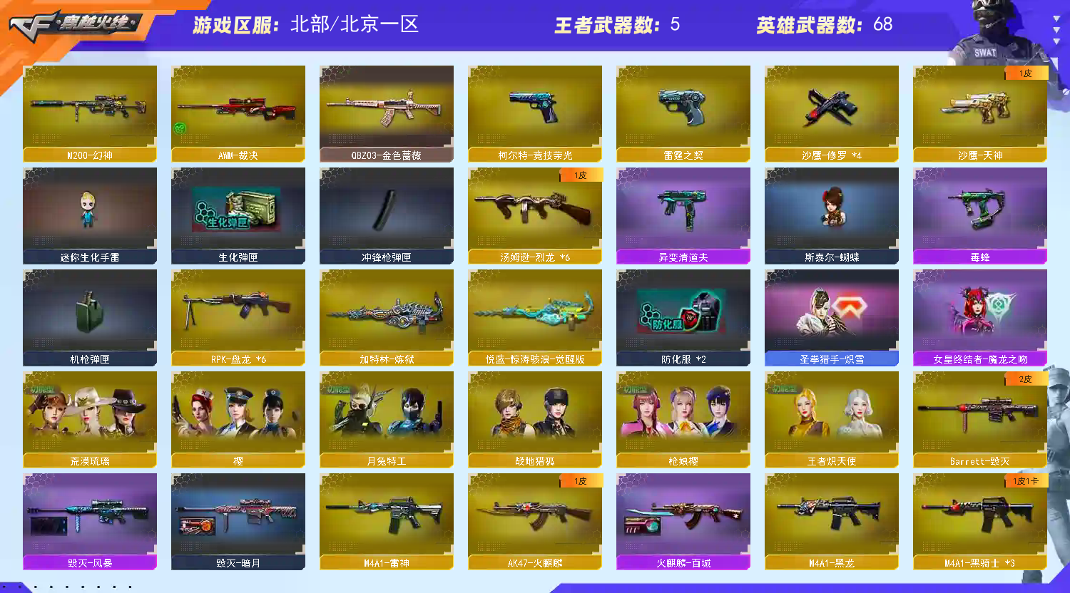 生化爆破双全装 生化爆破属性已刷 枪娘樱 荒漠琉璃 王者炽天使 月兔特工 HK417朱雀 9a91烈火 cop旗袍 黄金迷你裂空之翼 黄金迷你深渊冰龙 黄金生化钩 6烈+蝴蝶 毒蜂 异变清道夫 6盘炼狱惊涛骇浪佣兵觉醒不换弹!!;RPK-盘龙,QBZ03-金色蔷薇,M200-幻神,