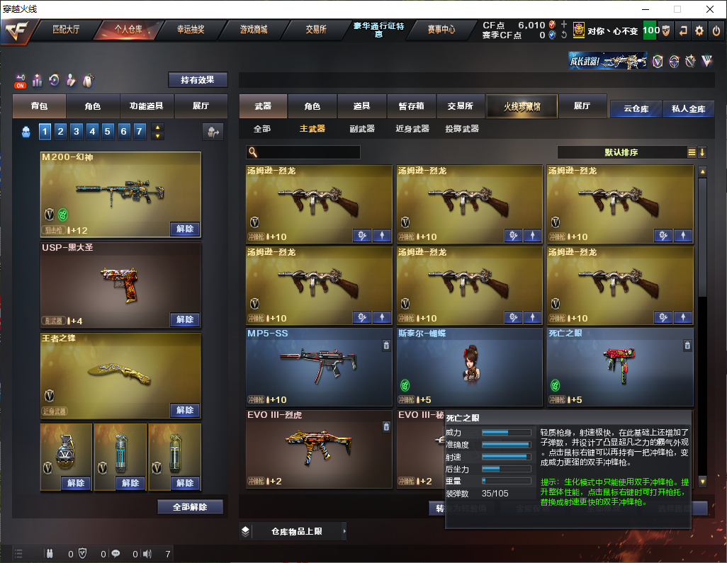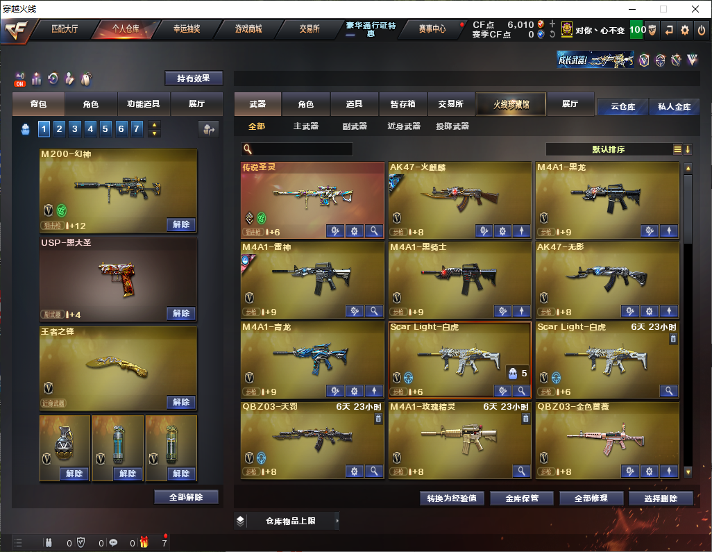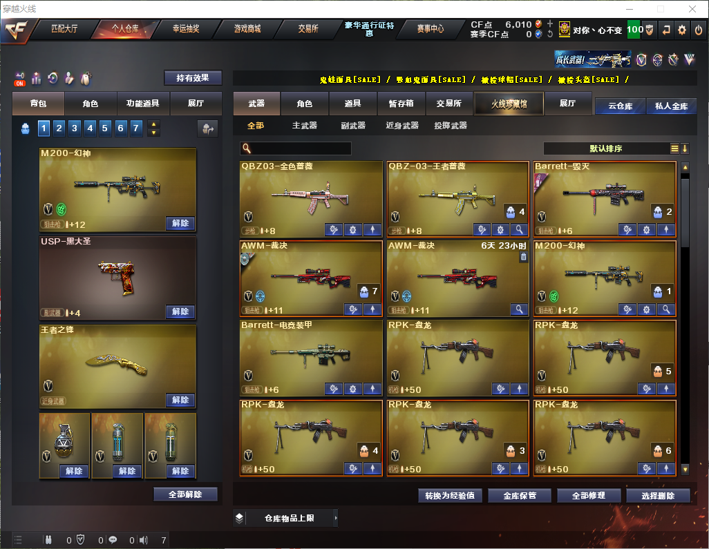 【主武器】M200-幻神/白虎/王者蔷薇qbz/传说圣灵/青龙/斯太尔蝴蝶/炼狱/⑥烈龙⑥盘龙/火麒麟/雷神/黑骑士/无影/②蔷薇qbz/毁灭/裁决/电竞装甲大炮/炫金雷神/海滩汪汪巴雷特/ 【副武器】②柯尔特电竞装甲/②修罗/天神/ 【近身武器】②屠龙/王者之峰觉醒/电竞装甲尼泊尔/擎天/麒麟刺/丛林匕首枪王排位 【投掷武器】迷你生化手雷/高爆幻灵/⑦电竞装甲恶棍+⑦烟闪 【角色】沙漠玫瑰+四防/乔伊教练/灵狐者职业经理+爆破四防/对讲机/炫彩背包/②戒指 【皮肤】炼狱-玩具皮肤+月皮肤/屠龙-春桃皮肤/修罗star皮肤 【音效卡】幻神音效卡/毁灭音效卡/雷神音效卡/火麒麟音效卡/黑骑士音效卡/毁灭云海游龙音效卡 【道具】元首/全背包/vip/变异宝贝/灵魂忍者/迷雾幽灵/步枪/机枪/冲锋枪/生化弹夹/机械猎手幻灵猎姬皮肤/生化爆破全装;沙漠玫瑰,RPK-盘龙,QBZ03-金色蔷薇,M200-幻神,Scar Light-白虎,