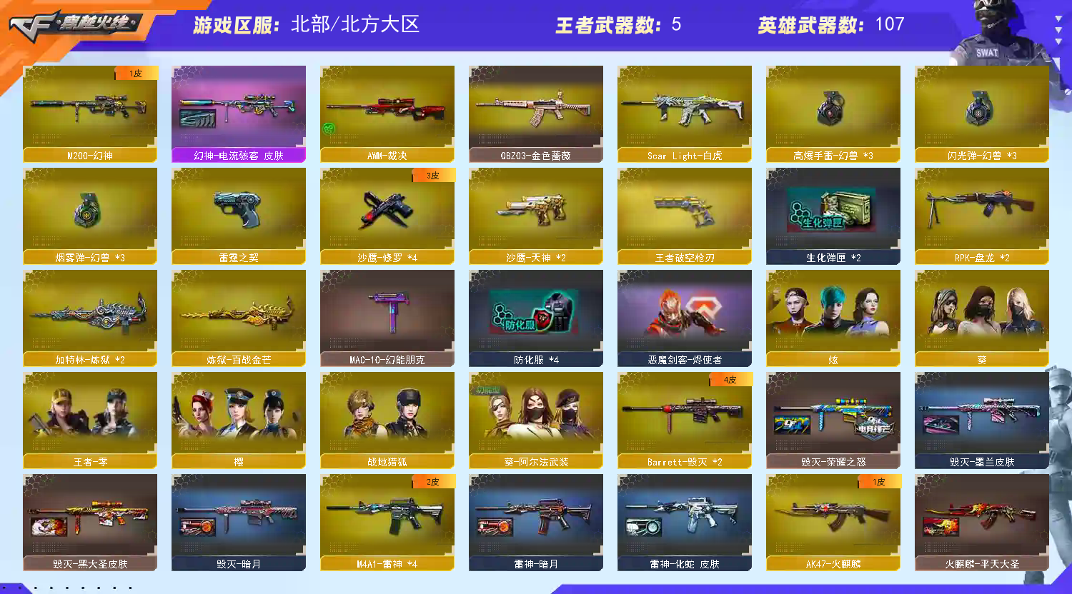 100V丨幻神丨白虎丨王者破空枪刃丨qbz蔷薇丨幻兽套丨雷霆套丨夜魔、雷暴刀丨炫、樱、葵、王者零;RPK-盘龙,QBZ03-金色蔷薇,M200-幻神,Scar Light-白虎,