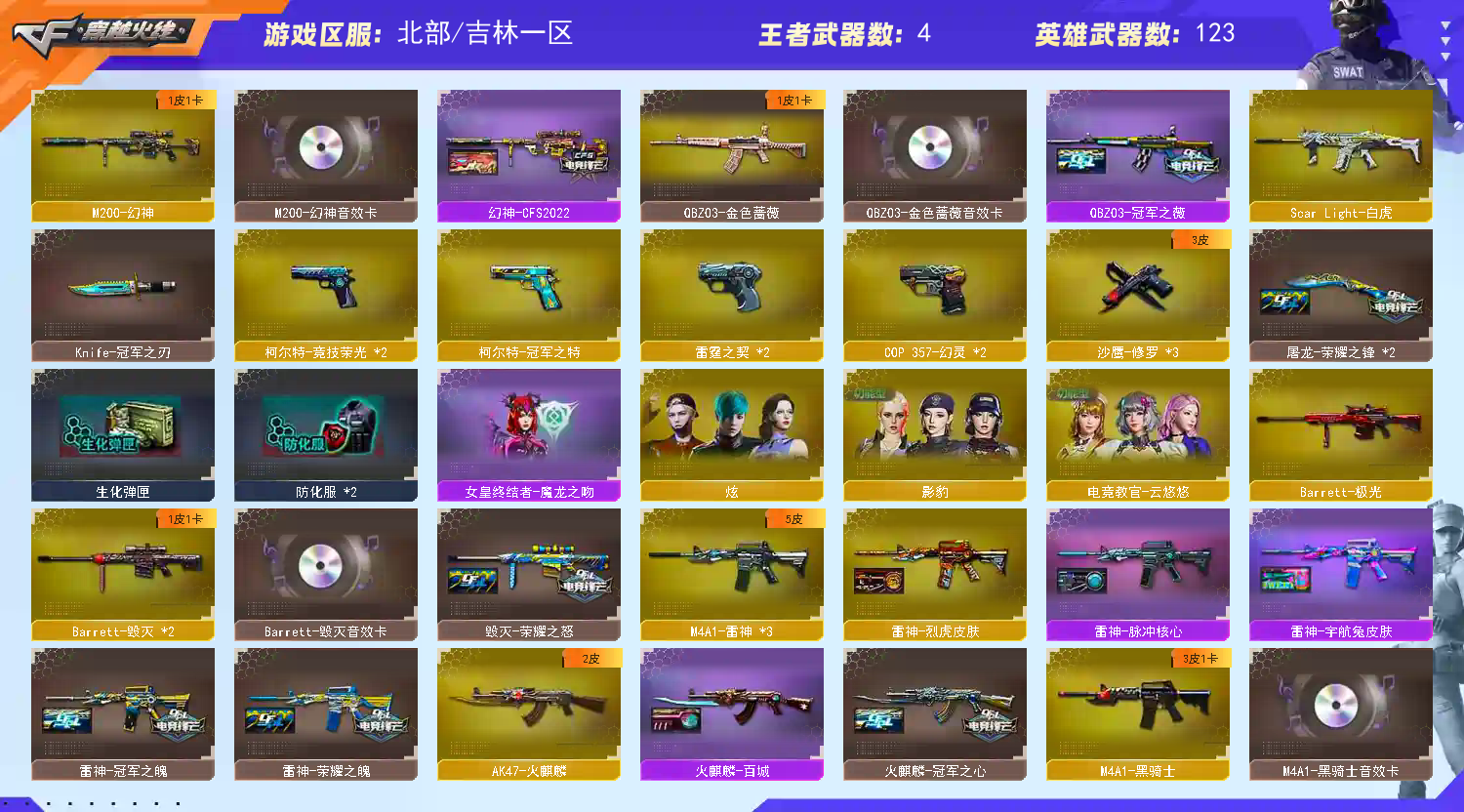首页 > 租号大厅 > 穿越火线 > 北部/吉林一区 > 幻神+CFS2022+幻音♥冠军之特+冠军之刃薇/音效竞技套柯尔特2cop5白虎