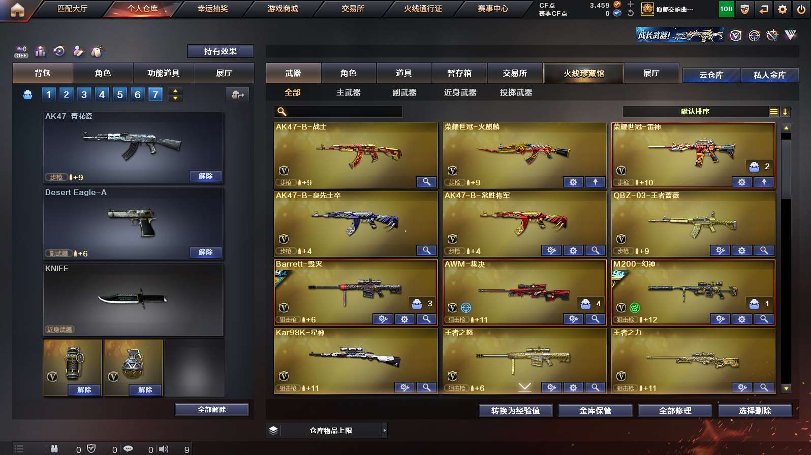 《m200幻神+幻神冠军之幻+幻神星耀》《98k星神》《裁决+裁决羽擎》《星神长生圣莲》《usp雷暴 柯尔特电竞装甲 荣耀世冠柯尔特 cop雷霆王者 cop旗袍 1911大黄蜂》《雷暴套/世冠套》《白虎》《qbz王者蔷薇》《qbz金色蔷薇》《烈火》《毁灭》《ak再燃火线》《火麒麟》《雷神》《黑骑士》《6烈龙 盘龙 炼狱 斯泰尔蝴蝶》《朱雀蛇隐宗》《雨棠 蛇隐宗满配 王者葵貂蝉 灵狐者职业经理 职业选手》《超级背包 亚洲杯纪念炫彩背包》《毁灭音效卡 死神雪域霜狐怀旧音效卡 雷神音效卡 火麒麟音效卡 黑骑士音效卡》《黑骑士冠军之势 毁灭荣耀之怒 火麒麟冠军之心 雷神荣耀之魄 雷神冠军之魄》;USP-雷暴,荣耀世冠-柯尔特,RPK-盘龙,QBZ03-金色蔷薇,M200-幻神,Scar Light-白虎,Kar98K-星神,