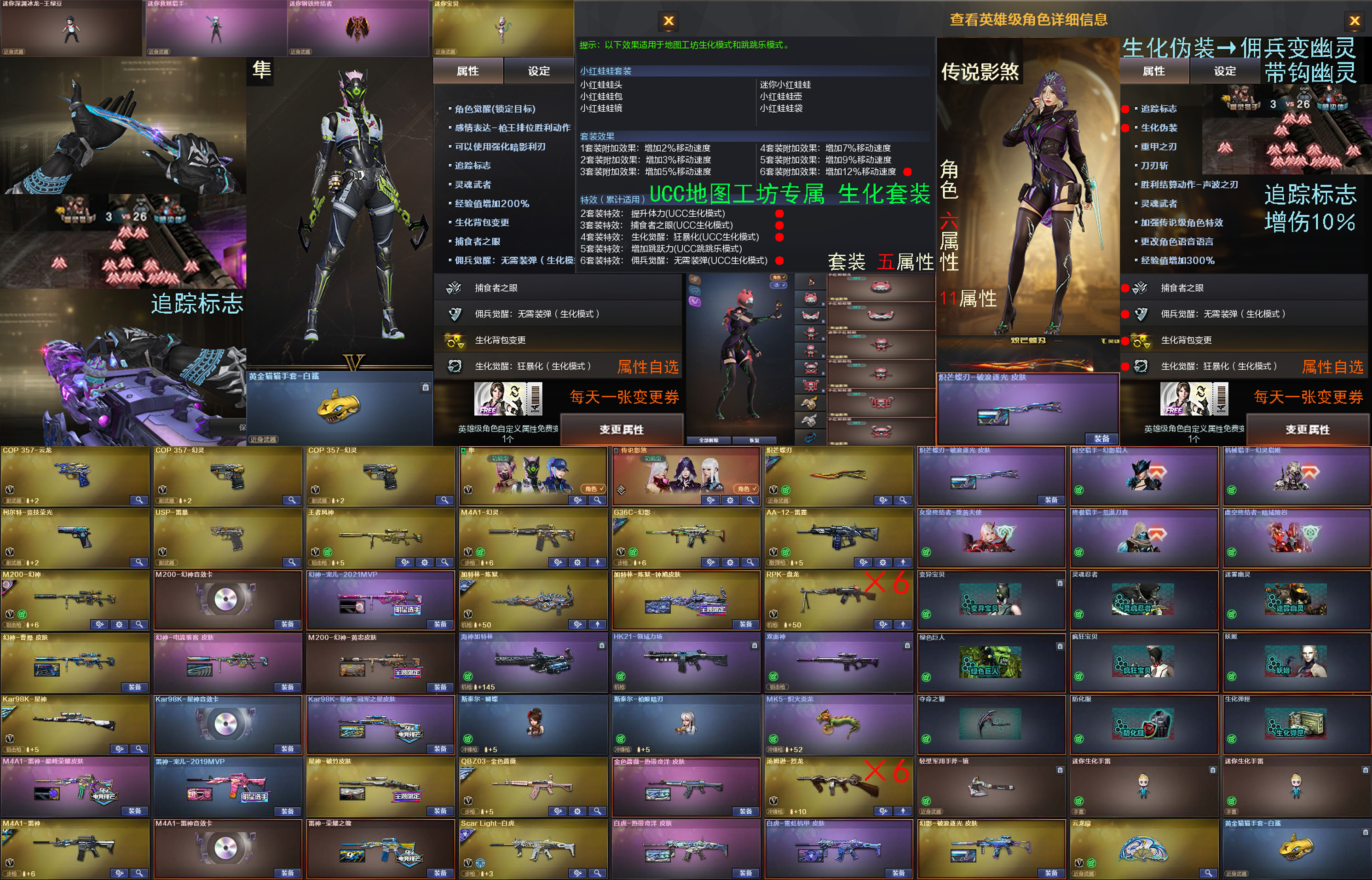 🈲禁用鼠标宏🈲禁违规插件,造成的追/封号十年将起诉至法院,平台提供IP身份信息,依法追责赔偿【中国裁判文书网】民事诉讼案。 切莫违规,绿色游戏,不要给自己找麻烦事。 ——————————————————————————— 可打字禁违规,到时不下线,记得及时续费,以免游戏中被挤掉,排位禁赛将受到拉黑。 不想玩维权理由选择其他,平台自动处理退款,部分装备消失不见,私人金库内查找取出。 喜欢可点击☆收藏,再次下单方便又快捷。 ——————————————————————————— 玩工坊30人乱斗前,进仓库卸下【机械猎手幻灵猎姬皮肤】,官方设定皮肤攻击力<地图作者自定义攻击力,其他猎手皮肤根据地图内伤害斟酌使用。 ———————————————————— ●角色【传说影煞】→最强生化角色,六属性(自带2自选4) ✅自带二属性(🔥生化伪装→可变鬼可变人🔥追踪标志→标记增减伤10%🔥) ✅自选四属性(生化背包变更、生化觉醒狂暴化、捕食者之眼、佣兵觉醒无需换弹、生存本能、狩猎本能、移动速度提升……) ●角色【隼】→生化角色,五属性(自带1追踪标志自选4) ———————————————————— ●服饰【地图工坊专属生化套装】套装五属性 ☆小红蛙蛙套装5属性:增加12%移动速度、提升体力、捕食者之眼、佣兵觉醒无需换弹、生化觉醒狂暴化。 ☆传说影煞6属性+小红蛙蛙套装5属性=11属性 ☆传说影煞6属性推荐:🔥生化伪装+追踪标志🔥生存本能+移动速度提升+额外护甲+子弹穿透…… ●叠加:套装属性增加12%移动速度+角色属性增加8%复活移速+炽芒蝶刃丢刀加移速 ———————————————————— ●生化模式: 炽芒蝶刃破浪逐光、黄金猫猫手套白鲨、云龙扇、手斧镜、4迷你妖姬生化手雷 斯泰尔枪娘暗刃+斯泰尔蝴蝶+MK5炽火炎龙+6烈龙 钟馗炼狱+HK21领域力场+海神加特林+6盘龙 幻灵套+G36C幻影+AA12雷霆+各种弹匣+各种生化道具 ☆猎手皮肤:时空猎手幻影猎人、机械猎手幻灵猎姬、圣拳猎手炽雪、终极猎手荒漠刀客、虚空终结者暗域熔岩、女皇终结者堕落天使、女皇终结者魔龙之吻、钢铁终结者湮灭之柱、救世主黑桃战神 ●爆破模式: 幻神音效卡+4皮【宠儿+曹操+黄忠+电流骇客+紫橙色光效】+2COP幻灵+COP云龙+USP雷暴+柯尔特竞技荣光+王者风神 星神音效卡+冠军之星皮肤+破竹皮肤 雷神音效卡+荣耀之魄+巅峰荣耀+雷神宠儿+LGD+宇航兔+蓝粉色光效 毁灭音效卡+AG冠军+荣耀之怒+冠军之怒 黑骑士音效卡+AG冠军+冠军之势 G36C幻影+破浪逐光、白虎霓虹机甲+白虎热带奇洋、金色啬蔷薇热带奇洋、极光高能霹雳、黑龙墨子、烈火熔核、天启高能霹雳、黑鲨电流骇客、屠龙星火燎原、屠龙破浪逐光、屠龙荣耀之锋、擎天冠军之击、龙啸冠军之啸…… ●四防角色: 【传说影煞】(生化角色:击杀标记增/减伤、专属伪装技能) 【隼】 (生化角色:击杀标记增/减伤) 【云悠悠】 (团队角色:减少手雷视听效果) 【晴雅】 (爆破角色:特殊攻击) 【影豹】 (爆破角色:显示队友轮廓) 【云悠悠】 (团队角色:减少手雷视听效果) 【华】 (爆破角色) 每天一次免费自选属性:生化背包变更、生存本能、狩猎本能、捕食者之眼、佣兵觉醒无需换弹、移动速度提升…… 【王者春】 固定爆破四防:防雷、防闪、防摔、副武器自动装填 【王者刀锋】 固定爆破四防:防雷、防闪、防摔、副武器自动装填 ●掌上武器: 雷神精英刀锋、QBZ03街机飒爽刀锋、王者COP精英刀锋、王者沙鹰神勇金戈、毁灭孙三炮、COP白鲨、白虎枪娘安妮、白虎迷你小艾、朱雀蛇隐宗、裁决雪莉杨、火麒麟灵狐、雷神小红、迷你宝贝、迷你钢铁终结者、巴雷特赏金猎人、迷你救赎猎手、猩红司令M37、真的是手枪、金色小号、牛牛AK47、CAT猫猫…… ●热门道具: 幻神、幻神三件套、6烈、炽芒蝶刃、幻神音效卡、星神音效卡、G36C幻影、生化、星神、Scar Light-白虎、传说影煞、星神三件套、雷神三件套;USP-雷暴,炽芒蝶刃,Knife-冠军之刃,传说影煞,隼,电竞教官-云悠悠,晴雅,