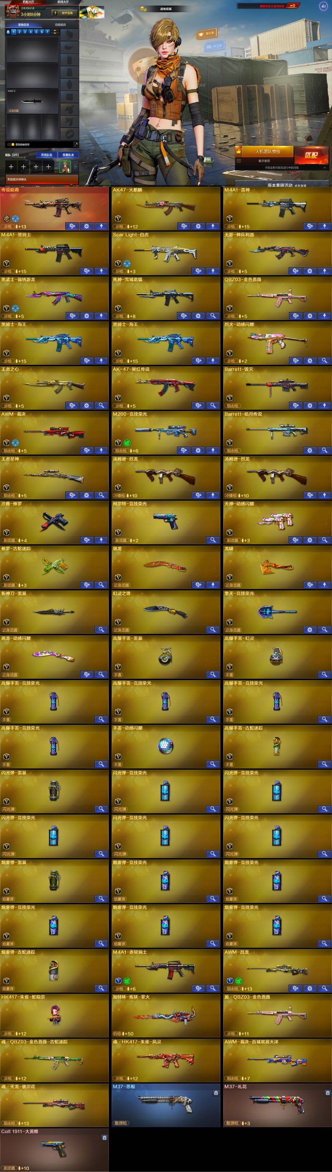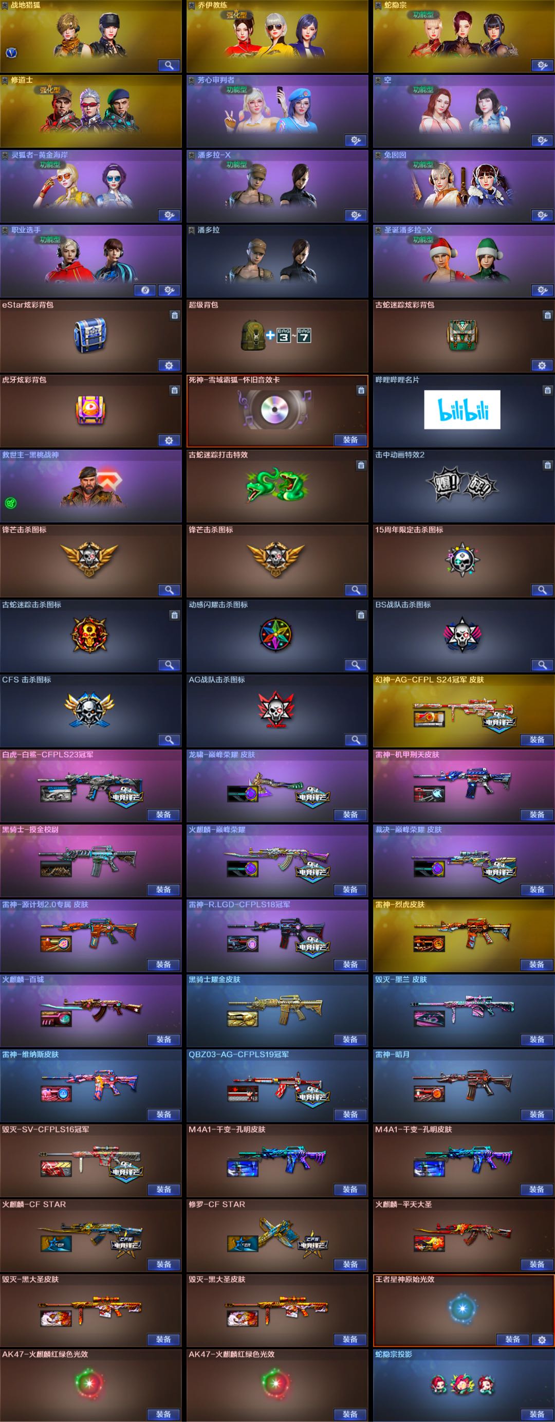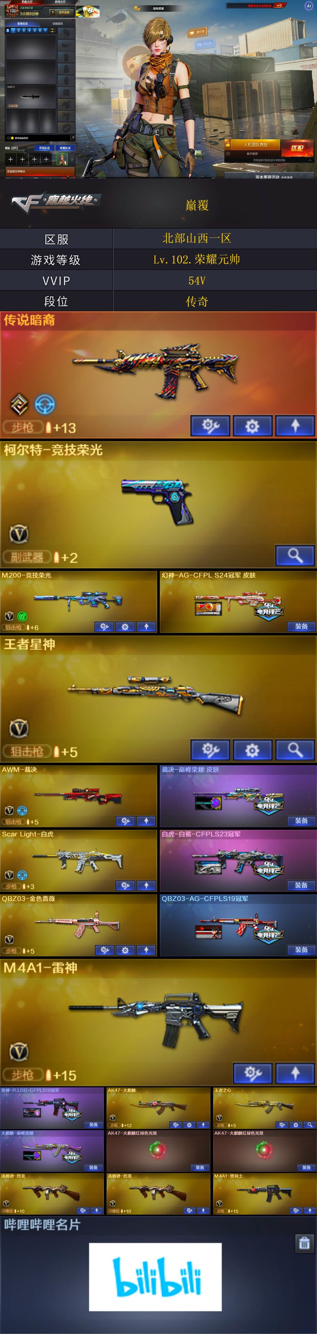 -【稀有武器】:传说暗裔/ScarLight-白虎/柯尔特-竞技荣光/天神-动感闪耀/修罗-古蛇迷踪/QBZ03-金色蔷薇/AK47-火麒麟/M4A1-雷神/M4A1-黑骑士/Barrett-毁灭/AWM-裁决/M200-竞技荣光/汤姆逊-烈龙(2)/斩神刀-雷暴/幻灵之锋/擎天-竞技荣光 【王者武器】:王者之心-觉醒版/王者星神-觉醒版 【热门角色】:乔伊教练/蛇隐宗/空/潘多拉-X/兔囡囡/职业选手/潘多拉 【热门皮肤】:幻神-AG-CFPLS24冠军皮肤/白虎-白鲨-CFPLS23冠军/裁决-巅峰荣耀皮肤/龙啸-巅峰荣耀皮肤/雷神-R.LGD-CFPLS18冠军/火麒麟-巅峰荣耀/QBZ03-AG-CFPLS19冠军 【其他亮点】:哔哩哔哩名片;QBZ03-金色蔷薇,Scar Light-白虎,传说暗裔,