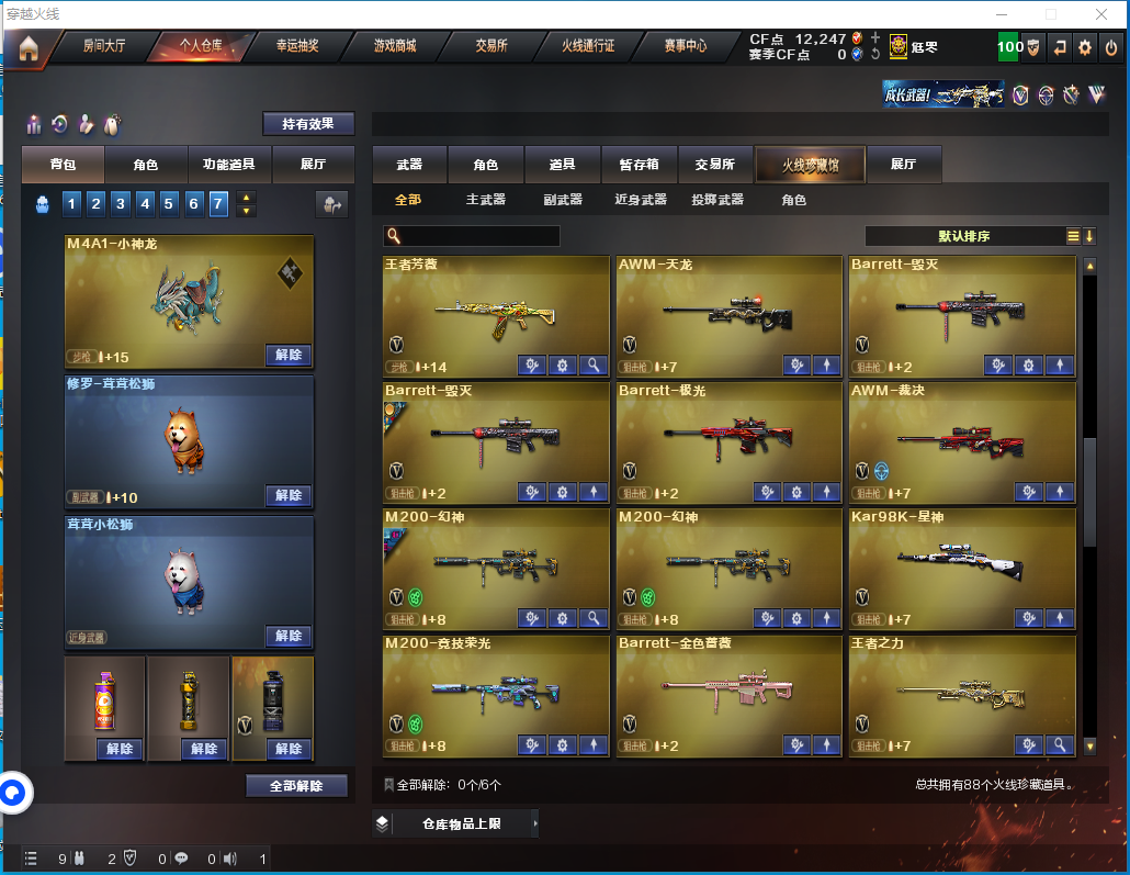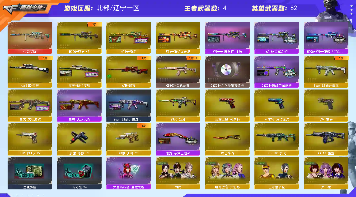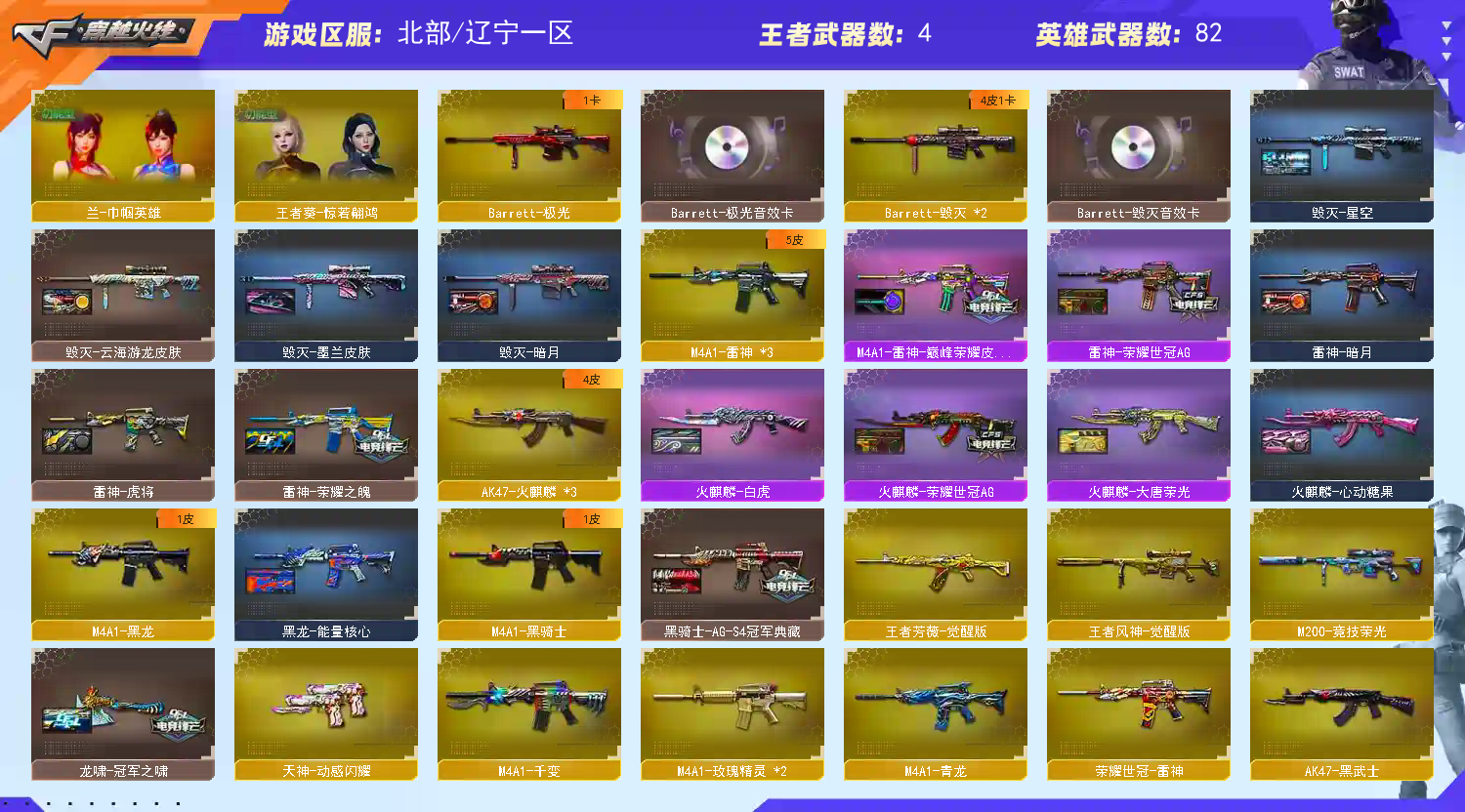 【辽宁一区-辽宁】 83V6王者炫金【主武器类型】 传说灵眸 M200-幻神 *2 王者风神觉醒版 M200-竞技荣光 Kar98K-星神 G36C-幻影 王者芳薇觉醒版 荣耀世冠-火麒麟 荣耀世冠-雷神 Scar-白虎 HK417-朱雀 M14EBR-玄武 Barrett-毁灭 *2 Barrett-极光 王者之力觉醒版 AWM-裁决 M4-小神龙 M4A1-雷神 *2 QBZ03-金色蔷薇 M4A1-黑龙 M4A1-黑骑士 M4A1-千变 M4A1-死神 M4A1-龙血 M4A1-猎神 M4A1-青龙 王者之心觉醒版 AK47-火麒麟 *3 无影神兵利器 AK47-黑武士 AK47-黑鲨 AK47-麒麟 AK47-机械迷城 *2 AK12-天启 AN94-超新星 烈火动感闪耀 烈龙-云海游龙 AA-12-雷霆 AWM-天龙 雷神小红 Cat-刀锋 M4A1-玫瑰精灵 *2 M4小黄鸡 Barrett暗月传说 Barrett金色蔷薇 地狱征服者超越Max 死亡之眼 AK47-B十周年 黄金AK 烟雾弹-荣耀世冠白鲨2023 高爆手雷竞技荣光 高爆手雷幻灵 *3 闪光弹幻灵 *4 烟雾弹幻灵 *3 手雷-云海游龙 动感闪耀手雷 【王者武器】 【副武器类型】 USP雷暴 荣耀世冠-柯尔特 柯尔特-竞技荣光 柯尔特赛博朋克 USP-神工天巧 真的是手枪 修罗-茸茸松狮 沙鹰-修罗 *3 沙鹰-天神 *3 天神动感闪耀 Colt1911小故障 Cfcolt1911大黄蜂 【近身武器类型】 蝴蝶刀-炽芒蝶刃 屠龙 *2 幻灵之锋 屠龙动感闪耀 荣耀世冠-龙啸 龙啸 麒麟刺 擎天-竞技荣光 擎天 擎天-云海游龙 唐刀-神工天巧 荣耀之证 猫猫手套 金刚伞电玩红兔 军用手斧镜 夺魂 【稀有角色】 电竞教官-云悠悠 王者潘多拉 关小雨 兰-巾帼英雄 司雨 王者葵-惊若翩鸿 职业选手 木兰 云海玲珑 乔伊教练 潘多拉X 铁骑荣耀 幻影 堕天使 超级护目镜 闪光护目镜 【武器皮肤及道具】 幻神-冠军之幻 M200-幻神-荣耀世冠白鲨 幻神-电流骇客 幻神-纸灯龙 幻神-降龙 星神-破竹 白虎-虎啸 白虎-大汉风骨 QBZ03-巅峰荣耀 雷神-荣耀之魄 雷神-荣耀世冠AG 雷神-巅峰荣耀 雷神-暗月 雷神-虎将 火麒麟-大唐荣光 火麒麟-心动糖果 火麒麟-白虎 火麒麟-荣耀世冠AG 黑鲨-电流骇客 毁灭-墨兰 毁灭-云海游龙 毁灭-星空 黑骑士-AG-S4冠军典藏 Scar-白虎-暗星 黑龙-能量核心 AWM-天龙-传奇70KG AWM-天龙-传奇白鲨 屠龙-荣耀世冠AG 龙啸-冠军之啸 毁灭音效卡 QBZ03-金色蔷薇音效卡 极光音效卡 【稀有套装】;USP-雷暴,荣耀世冠-柯尔特,炽芒蝶刃,电竞教官-云悠悠,QBZ03-金色蔷薇,G36C-幻影,M200-幻神,