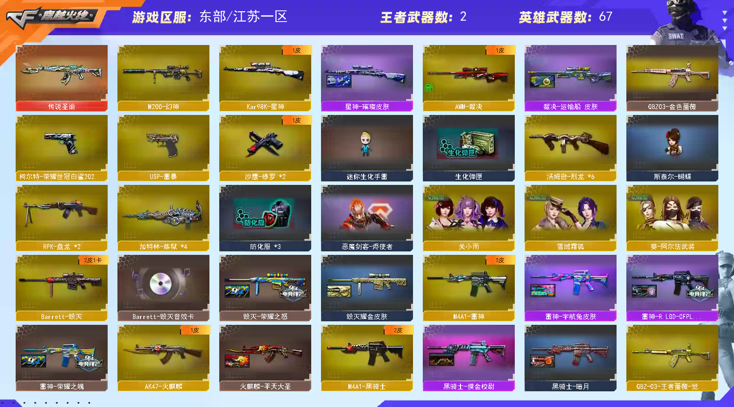 68v-幻神-星神-星神璀璨-传说圣谕-朱雀-qbz金色蔷薇-荣耀世冠火麒麟-王者蔷薇-白虎电玩蓝兔-毁灭-裁决-盘龙-4炼狱-6烈龙-usp雷暴-柯尔特2023-屠龙-龙啸-擎天-麒麟刺-关小雨-毁灭音效卡-裁决运输船-雷神LGD-炽芒蝶刃2023-冠军之啸-荣耀之怒-荣耀之魄 请看截图 喜欢请点收藏 方便下次租 可以当成自己号玩【感谢老板租此号】优质账号 如果有个别装备到期 影响不大的情况下请不要维权,如遇到账号密码错误 顶号 冻结 请直接维权即可, 科技大佬麻烦看了请绕道,出zu不易,给你跪下了!;USP-雷暴,柯尔特-荣耀世冠白鲨2023,RPK-盘龙,QBZ03-金色蔷薇,M200-幻神,Kar98K-星神,传说圣谕,