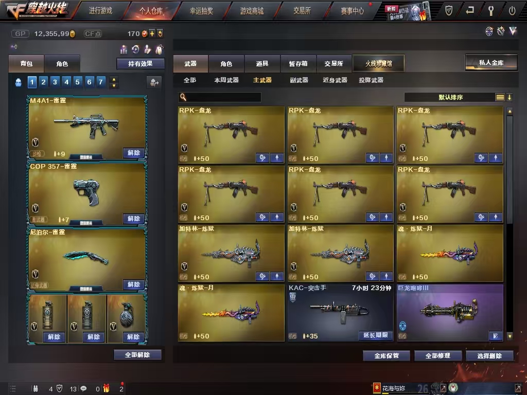 王者武器:王者之武;超新星-悦享;炫金毁灭;炫金天龙;炫金黑龙;炫金超新星;王者之魄;王者之翼;王者之力;王者之怒-觉醒版;王者之心;炫金修罗 英雄武器:加特林-炼狱;Barrett-毁灭;M4A1-雷霆;闪光弹-雷霆;烟雾弹-雷霆;高爆手雷-雷霆;雷霆之怒;AK47-黑武士;麒麟刺;M4A1-龙血;M4A1-猎神;擎天;AK47-黑鲨;Barrett-极光;雷霆之锋;雷霆之契;无影-神兵利器;M4A1-雷神;屠龙;M4A1-死神;AK47-火麒麟;AWM-裁决;RPK-盘龙;M4A1-武圣;汤姆逊-烈龙;9A91-烈火;沙鹰-修罗;barrett-金色蔷薇;龙啸;M4A1-千变;M4A1-千变;AWM-天龙;QBZ03-金色蔷薇 角色:炫;灵狐者;空;兰-海滩派对;灵狐者-黄金海岸;零-水下丽影;王力宏;救世主;飞虎队;曼陀罗;幻影;救世复仇;复仇者;雷霆-β;猎狐者-X;铁骑 道具:超级背包;极限战斗背包;烟雾保护头盔;防弹头盔;C4工具钳;手雷包;防弹衣;步枪弹匣;变异宝贝;王者之心金色光效;冲锋枪弹匣;闪光护目镜;生化弹匣;烟雾保护头盔;手雷包;C4工具钳;手雷包;防化服;机枪弹匣;防化服;C4工具钳;手雷包;RPK-盘龙,QBZ03-金色蔷薇,