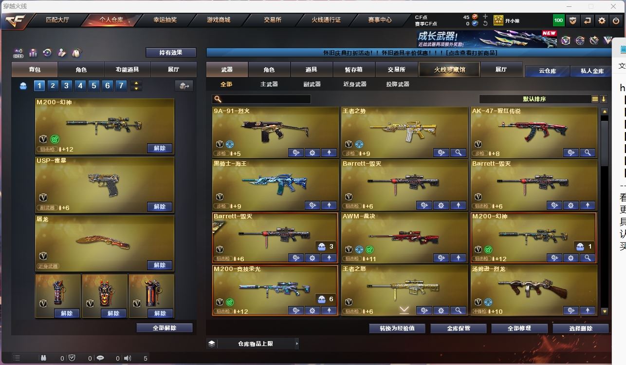【m200幻神】【m200竞技荣光套+usp雷暴】【scar白虎】【qbz金色蔷薇】【hk417朱雀】【黑龙+卡】【雷神+卡】【黑骑士+卡】【裁决】【武器:火麒麟 雷神 黑骑士 无影 王者之势 海王 毁灭 烈龙*2】【6手枪:修罗*2 堕天神 竞技荣光 usp雷暴 】【12刀具:屠龙*3 龙啸 擎天 麒麟刺堕天神 竞技荣光 竞技荣光 王者之击 】【7雷套:堕天神雷*4 竞技荣光雷*3】【小人枪:裁决雪莉杨 】【音效卡:黑龙音效卡 雷神音效卡 黑骑士音效卡 】【角色:迷迭香 审判者 王者瞳闭月羞花 】;USP-雷暴,QBZ03-金色蔷薇,M200-幻神,Scar Light-白虎,