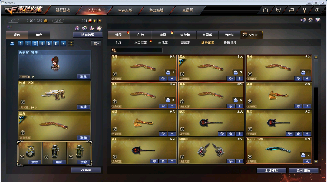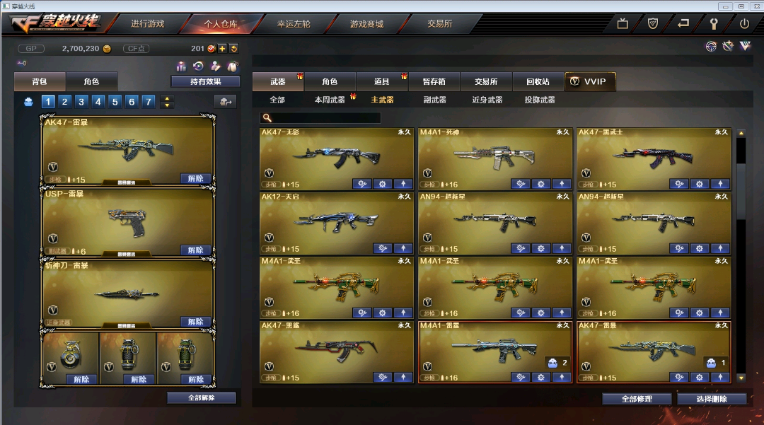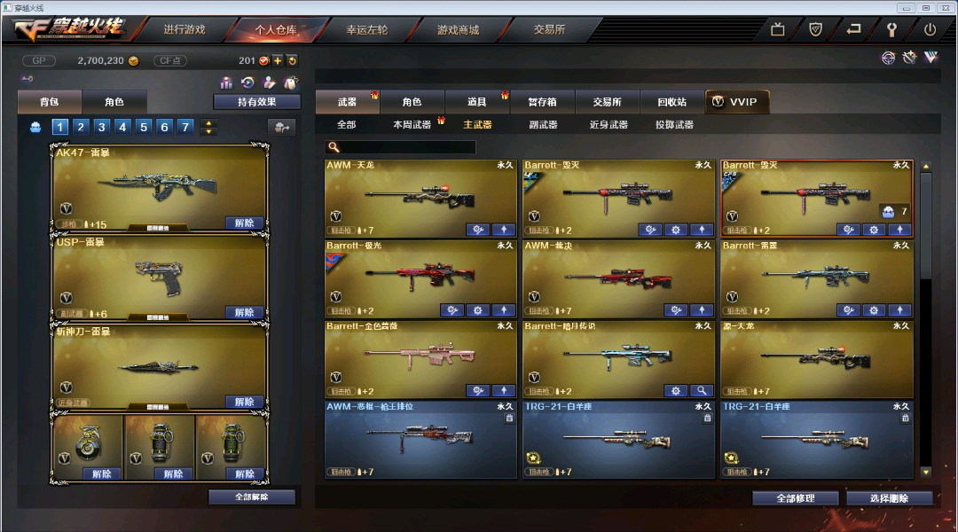【步枪系列】M4A1-雷神*5/黑骑士/死神/武圣*3/雷霆/能量核心/AK47-火麒麟*3/无影*4/黑武士/雷暴/黑鲨/冰龙粉碎者/AN94-超新星/AK12-天启/QBZ03-金色蔷薇/激光毁灭者/机械赤魂 【狙击枪】 AWM-天龙/裁决/Barrett-毁灭*2/极光/雷霆/金色蔷薇/暗月传说 【辅助枪】 RPK-盘龙 *2/ 加特林炼狱/汤姆逊-烈龙*6/M37-葵/征服者超越3/激光毁灭者III/神圣爆裂者III/迷你生化手雷/死亡之眼/ 斯太尔蝴蝶 / /生化号 / 爆破号 / 【炫金王者】王者之翼觉醒/王者之武觉醒/ 【角色】春/炫/王者复仇/兰-海滩派对/灵狐者-黄金海岸/零-水下丽影/青霞仙子/娟娟【佣兵觉醒 无需换弹7秒/生化觉醒 狂暴化】捕食者之眼 【副武器】 /沙鹰-天神*2/沙鹰-修罗*3/雷暴/雷霆/COP-旗袍 【近身武器】麒麟刺 / 龙啸 *2/ 屠龙 *5 /擎天*3/尼泊尔雷霆/斩神刀雷暴/ 【投掷武器】雷霆套装*7/雷暴套装*7/迷你生化手雷 【通用道具】双1-7背包 / 手枪弹匣 / 金蛇戒 / 狙击枪弹夹 / 魔龙戒 / 圣龙戒 / 挑战弹夹 / 银蛇戒 / 防弹头盔 / 烟雾保护头盔 / 防弹衣 / C4工具钳 / 手雷包 / 步枪弹匣 / 冲锋枪弹匣 / 机枪弹匣 / 闪光护目镜/超级护目镜/超级背包/透明头盔/透明护目镜/ 超级对讲机 /新彩色昵称/C4.红龙 【生化专用道具】生化弹夹/防化服/幽灵之刃/减少停顿道具(不退包)/灵魂忍者/绿巨人/变异宝贝/ 迷你生化手雷 / 肩膀佩戴超级对讲机(榴弹3/22) 【皮肤玩偶音效】【火麒麟AG战队/CFS2018/雷神/STAR】【雷神星空/荣耀之魄/能量核心/暗月】【无影能量核心/耀金】【毁灭星空/荣耀之怒/CFS2018】【极光能量核心】【修罗SFS2018】【屠龙荣耀之锋】【玩偶铁骑/审判者/小红/白狼/王胖子/蝴蝶】 【音效卡雷神-火麒麟-毁灭-黑骑士】 【4大战区】北部战区;USP-雷暴,RPK-盘龙,QBZ03-金色蔷薇,