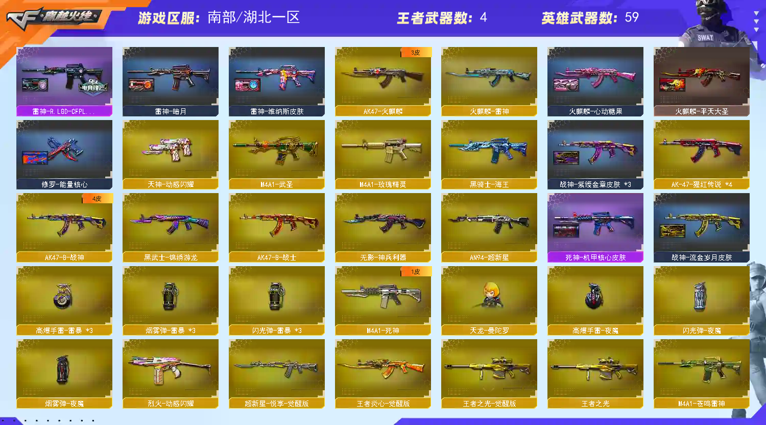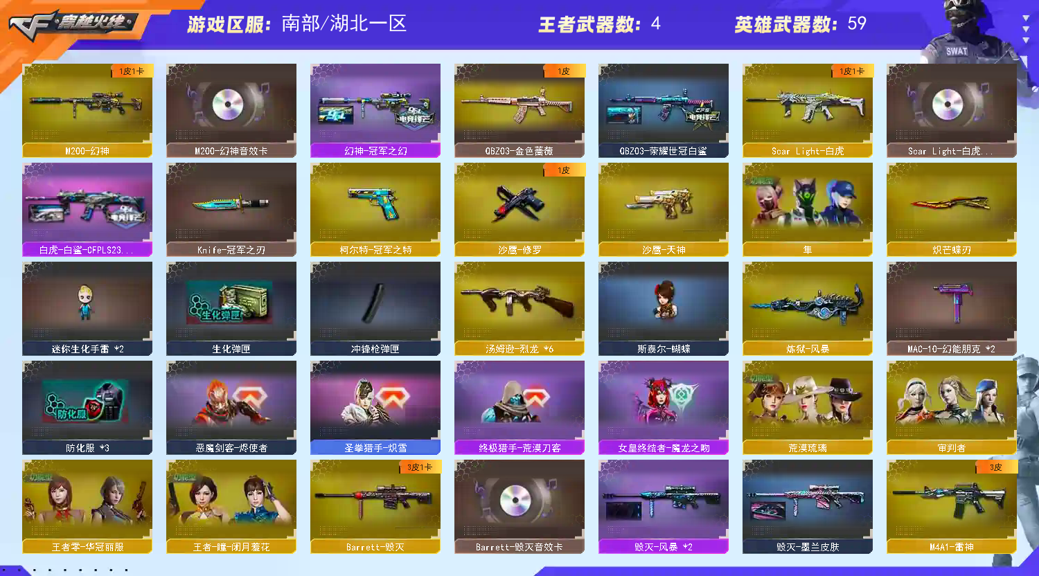 道具都有;柯尔特-冠军之特,炽芒蝶刃,Knife-冠军之刃,隼,QBZ03-金色蔷薇,M200-幻神,Scar Light-白虎,