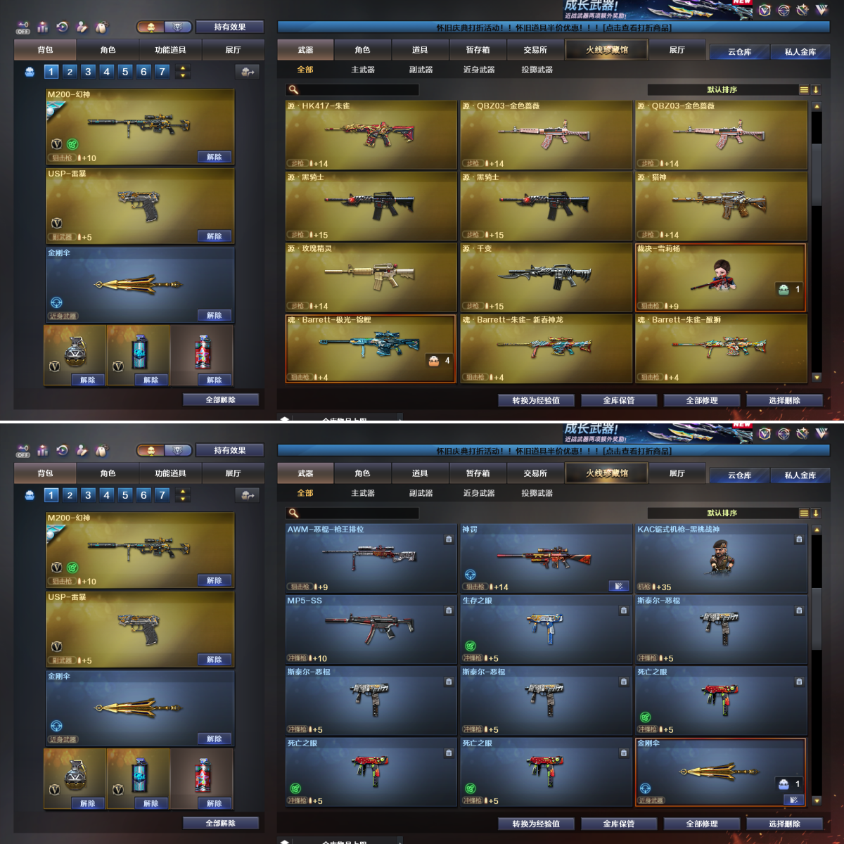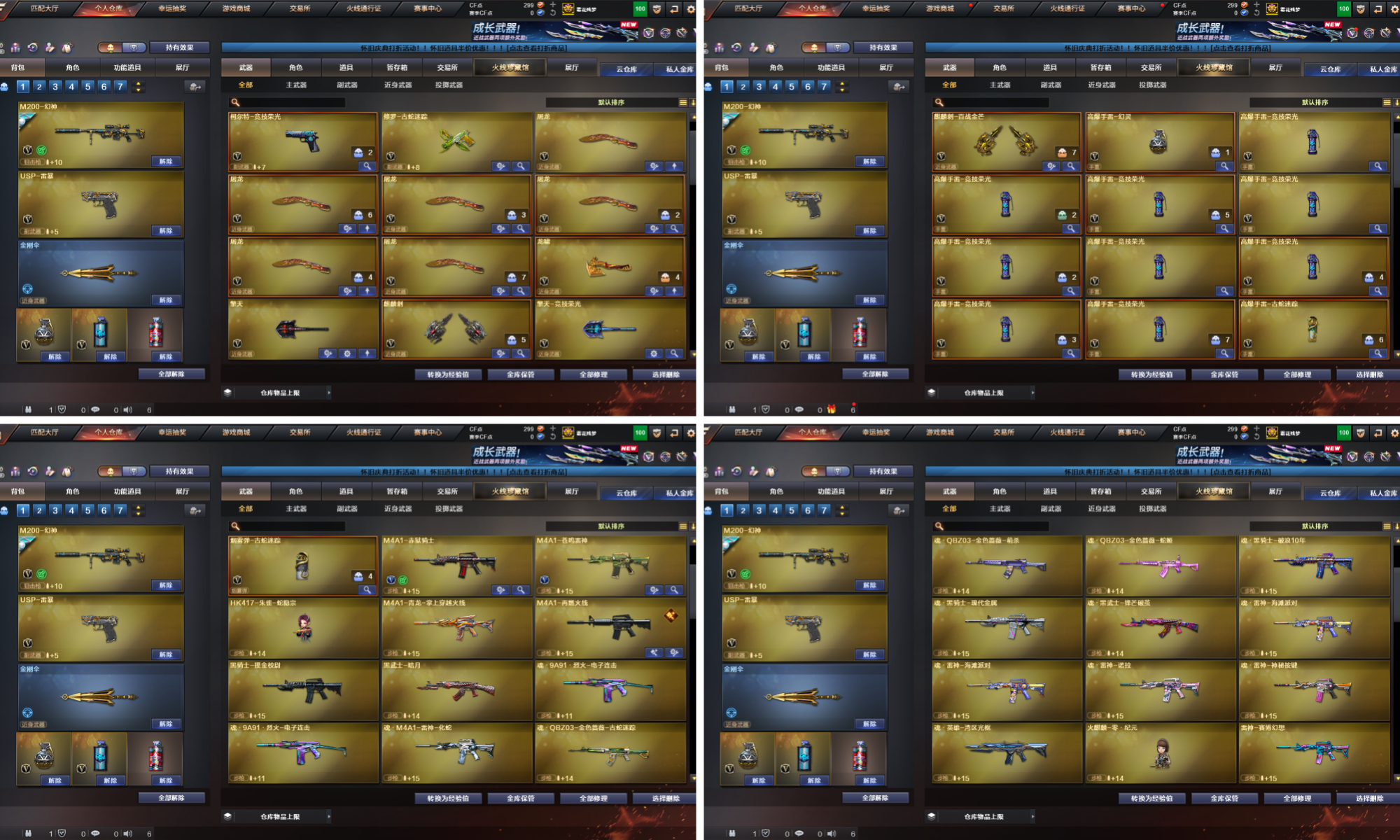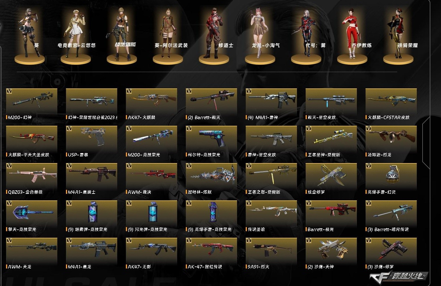 +传说圣谕+幻神三件套+幻神双皮/荣耀世冠白鲨/AG冠军🔥竞技荣光套+裁决音效卡+USP雷暴等;USP-雷暴,电竞教官-云悠悠,QBZ03-金色蔷薇,M200-幻神,传说圣谕,