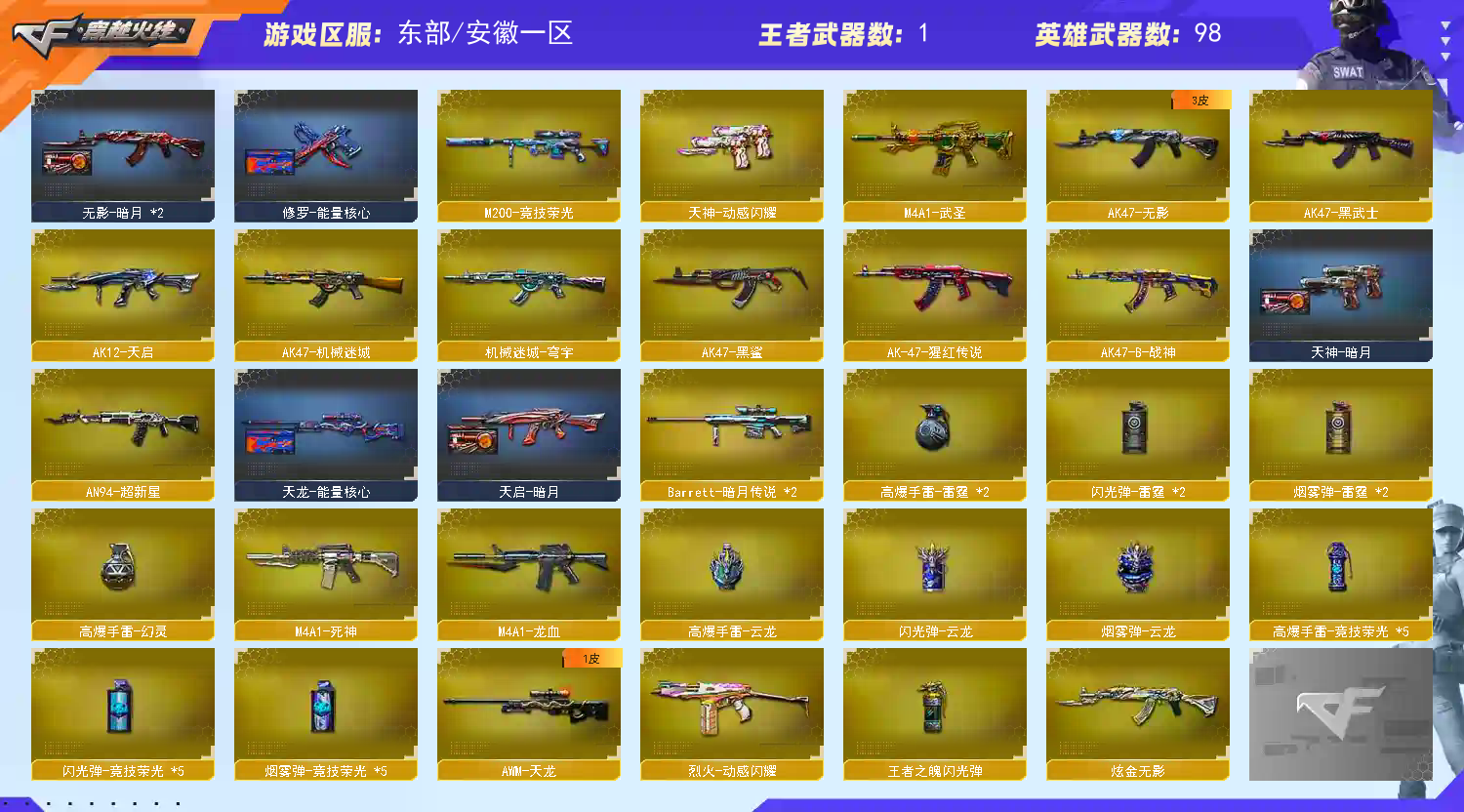 99V✅4防满开✅6盘6烈6炼狱✅玄豹手雷套✅星神裁决竞技荣光✅柯尔特竞技荣光usp雷暴✅全道具