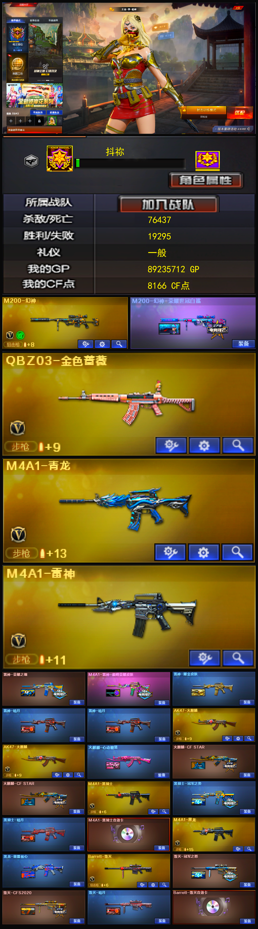 【m200幻神+荣耀世冠白鲨】【qbz金色蔷薇】【火麒麟】【黑龙】【雷神+巅峰荣耀+荣耀之魄】【黑骑士+冠军之势】【毁灭+冠军之怒】 【武器:黑武士 青龙 王者之势 海王 天龙 毁灭 极光*3】 【手呛:修罗*3 沙鹰天神*3】 【刀具:天龙*3 龙啸 擎天 麒麟刺*2 尼泊尔雷霆 斩神刀雷暴 王者之锋 王者之啸 王者之击】 【雷套:雷霆雷 雷暴雷】 【小人呛:雷神精英刀锋】 【音效卡:毁灭音效卡 黑骑士音效卡 】 【四防角色:王者葵貂蝉 职业经理】;QBZ03-金色蔷薇,M200-幻神,
