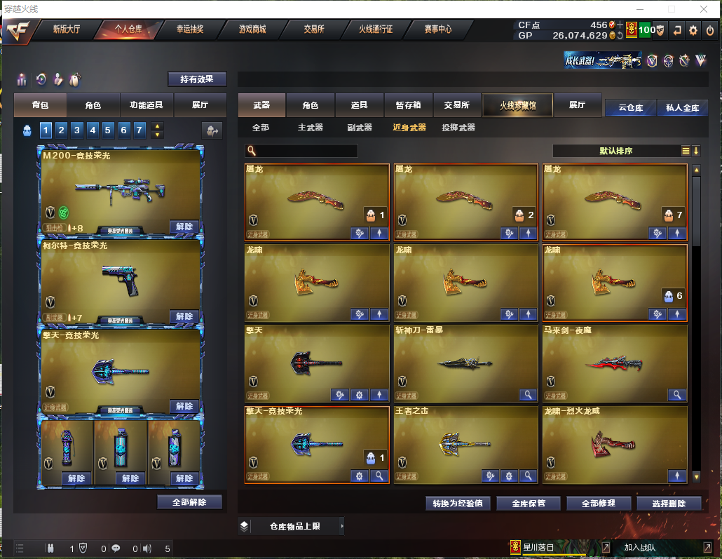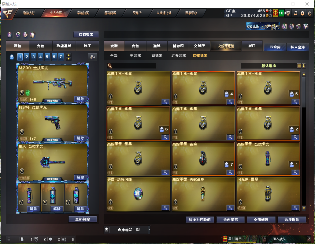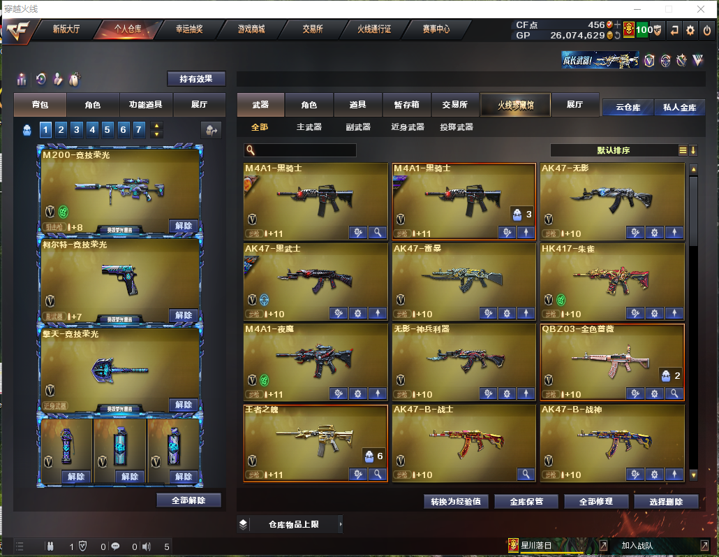 【主武器】M200-幻神竞技荣光/M4夜魔/朱雀/ak雷暴/蔷薇qbz/斯太尔蝴蝶/⑥烈龙盘龙②炼狱/雷神/火麒麟/黑龙/2黑骑士/无影/黑武士/蔷薇qbz/王者之魄觉醒/王者炎心觉醒/黑骑士/身先士卒/常胜将军/天龙/毁灭/极光/暗月传说大炮/王者之城/朱雀蛇隐宗/火域乱世超越Max/机甲撕裂者3/冰龙/aa12擎天柱/神圣爆裂者末日3/神圣爆裂者3/试炼破坏者3/M37-葵/ 【副武器】COP357-雷霆王者觉醒/②COP堕天神/②破空枪刃夜魔/柯尔特-竞技荣光/USP-雷暴/修罗/天神/天神动感闪耀/cop旗袍/2涂鸦手枪/ 【近身武器】擎天竞技荣光/3屠龙/3龙啸/擎天/斩神刀雷暴/马来剑夜魔/王者之击觉醒/王者之刺/深渊冰龙/ 【投掷武器】⑦高爆手雷-雷暴+烟闪/高爆竞技荣光+烟闪/高爆动感闪耀/高爆手雷-古蛇迷踪/迷你生化手雷/生化手雷 【角色】电竞教官云悠悠+四防/王者玲珑/春/迷迭香/乔伊教练/审判者/修道士/蛇隐宗/灵狐者职业经理/对讲机/对讲机 【皮肤】火麒麟-枪娘凯萨林/毁灭-耀金皮肤/火麒麟-AG战队皮肤/ 【音效卡】毁灭音效卡/极光音效卡/黑骑士音效卡 【道具】元首/全背包/vip6/变异宝贝/灵魂忍者/妖姬/步枪/冲锋枪/机枪/生化弹夹/生化爆破全装;USP-雷暴,电竞教官-云悠悠,RPK-盘龙,QBZ03-金色蔷薇,