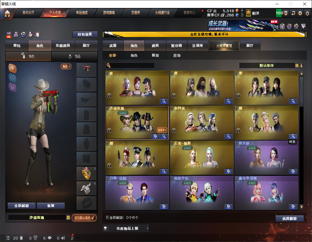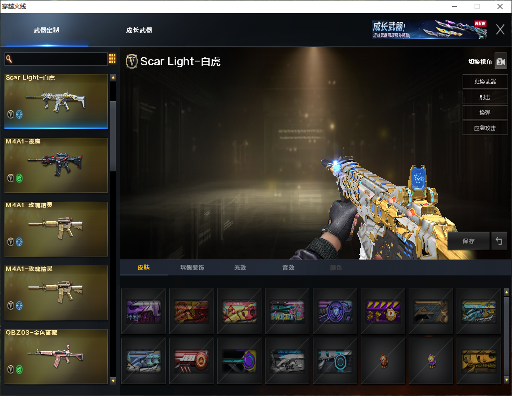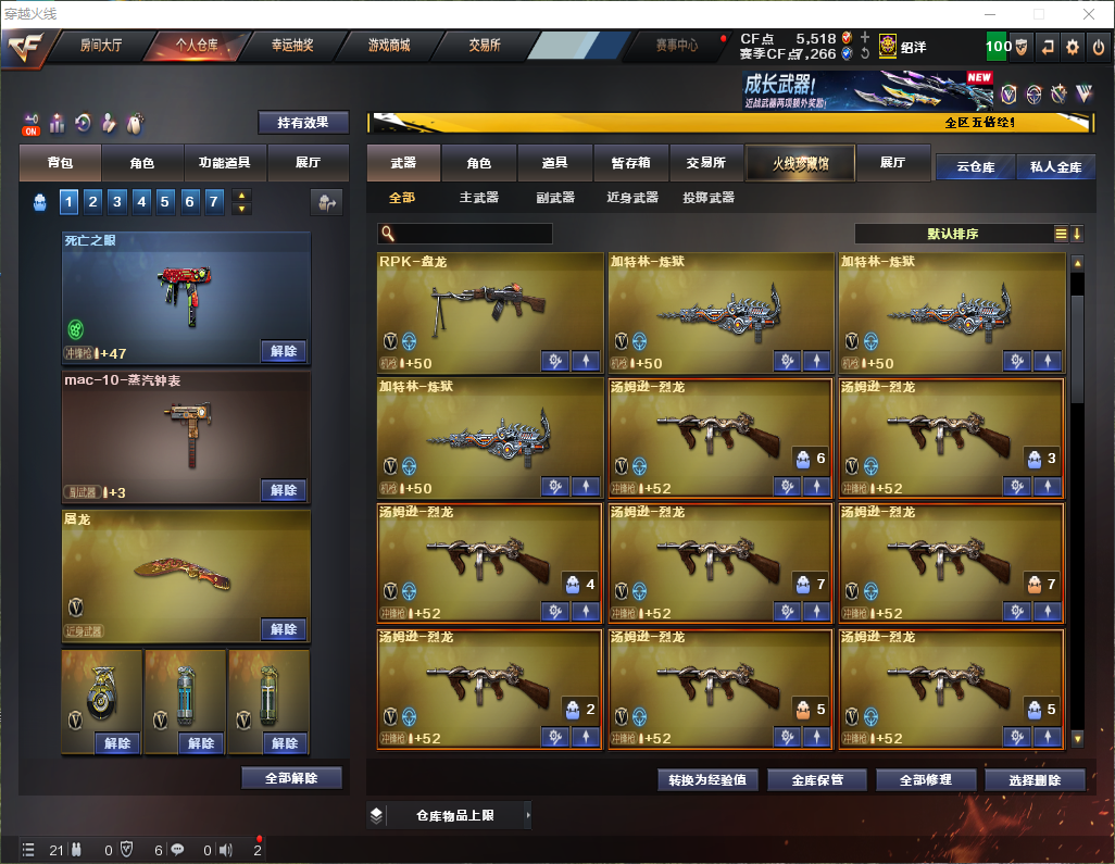 【主武器】②白虎/③裁决/AK雷暴/m4夜魔/③炼狱盘龙/⑥烈龙/千变/⑦火麒麟/⑤雷神/②黑龙/⑤黑骑士/无影/③死神/黑武士/②天启/②超新星/武圣/②机械迷城/黑鲨/龙血/②玫瑰精灵/②蔷薇qbz/猎神/烈火/王者之幻觉醒版/④天龙/⑥毁灭/电竞装甲大炮/蔷薇大炮/王者之怒觉醒版/王者之力觉醒版/雷神精英刀锋/王者之翼/炫金雷神/炫金超新星/炫金骑士/炫金武士/圣炎切割者3/巨龙咆哮3/神圣爆裂者3/ 【副武器}】USP-雷暴/②柯尔特电竞装甲/④修罗/天神/武圣手枪/涂鸦手枪 【近身武器】⑨屠龙/③擎天/⑦麒麟刺/尼泊尔雷霆/斩神刀雷暴/麒麟刺堕天神/龙啸堕天神/王者之刺觉醒版/王者之击觉醒版/电竞装甲尼泊尔/②王者之峰/手斧镜 【投掷武器】⑦高爆雷暴+⑦烟闪/②高爆雷霆+②烟闪/②高爆堕天神+烟闪/⑦恶棍电竞装甲+⑦烟闪/生化手雷 【角色】沙漠玫瑰+四防/春/葵/零/审判者/瞳/樱/零水下丽影/灵狐者黄金海岸/职业选手/对讲机/炫彩背包/真龙戒/圣龙戒/魔龙戒 【皮肤】毁灭-荣耀之怒-AGCFPLS15冠军-耀金皮肤/火麒麟-冠军之心-AG战队-star皮肤/修罗-冠军之魂-star皮肤/天龙-传奇白鲨-传奇70KG皮肤/黑骑士-耀金皮肤 【音效卡】火麒麟音效卡 【道具】元首/全背包/VIP6/AC/烟雾头/变异宝贝/疯狂宝贝/灵魂忍者/绿巨人/迷雾幽灵/步枪/机枪/生化弹夹/生化爆破全装;USP-雷暴,沙漠玫瑰,RPK-盘龙,QBZ03-金色蔷薇,Scar Light-白虎,
