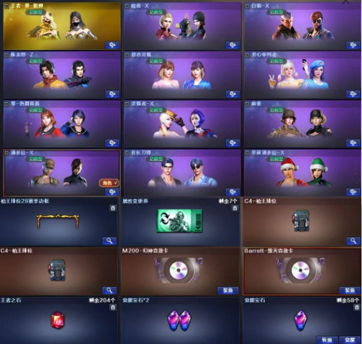 【王者武器】:【王者之击-觉醒版-1,王者之啸-觉醒版-2,王者之锋-觉醒版-1】 【英雄武器】:【M4A1-死神-1,屠龙-2,龙啸-2,AK47-火麒麟-1,Barrett-毁灭-1,沙鹰-修罗-3,沙鹰-天神-1,M4A1-雷神-1,M200-幻神-1,USP-雷暴-1,斩神刀-雷暴-1,M200-竞技荣光-1,幻灵之锋-1,擎天-竞技荣光-1,机械迷城-穹宇-1,柯尔特-竞技荣光-1,烟雾弹-竞技荣光-7,白虎-电玩蓝兔-1,闪光弹-竞技荣光-7,高爆手雷-竞技荣光-7,马来剑-夜魔-1,Barrett-暗月传说-2,QBZ03-金色蔷薇-1,AWM-裁决-1,AK47-B-常胜将军-1,AK47-B-身先士卒-1,荣耀世冠-柯尔特-1,黑骑士-海王-1,AK47-B-战士-1,M4A1-龙血-3】 【装饰品】:【黑骑士-暗月-1,王者刀锋玩偶-1,毁灭-冠军之怒-1,雷神-宠儿-2019MVP-1,AK47-火麒麟-传奇EVEN-1,火麒麟-轻羽皮肤-1,火麒麟玩偶-1,雷神-耀金皮肤-1,Scar Light-白虎-暗星-1,战神-粉色甜心皮肤-1,战神-流金岁月皮肤-1,AK47-B-常胜将军-刘备-1,AK47-B-常胜将军-孙权-1,雷神-荣耀之魄-1,幻神-宠儿-2021MVP-1,毁灭-黑大圣皮肤-1,CFS 击杀图标-1】 【角色】:【金戈,堕天使,复仇者,幻影,雷霆-β,猎狐者,波塞冬,夜玫瑰,活力灵狐,雪莉杨-摸金校尉,夜玫瑰-X,圣诞潘多拉-X,白狼-X,新娜塔莎,紫霞,剑齿虎,麻雀,王者-葵-貂蝉,陈龙野-Z,芳心审判者,社长刀锋,暗夜-X,樱-青春偶像,职业选手】 【道具】:【超级背包-1,炫彩背包-1,烟雾保护头盔-1,闪光护目镜-1,防弹头盔-1,手雷包-1,C4工具钳-1,防化服-1,夺命之镰-1,灵魂忍者-1,疯狂宝贝-1,迷雾幽灵-1,步枪弹匣-1,皇龙戒-1,Barrett-毁灭音效卡-1,M200-幻神音效卡-1,绿色巨人-1,黄金头骨护目镜-1】;USP-雷暴,荣耀世冠-柯尔特,QBZ03-金色蔷薇,M200-幻神,