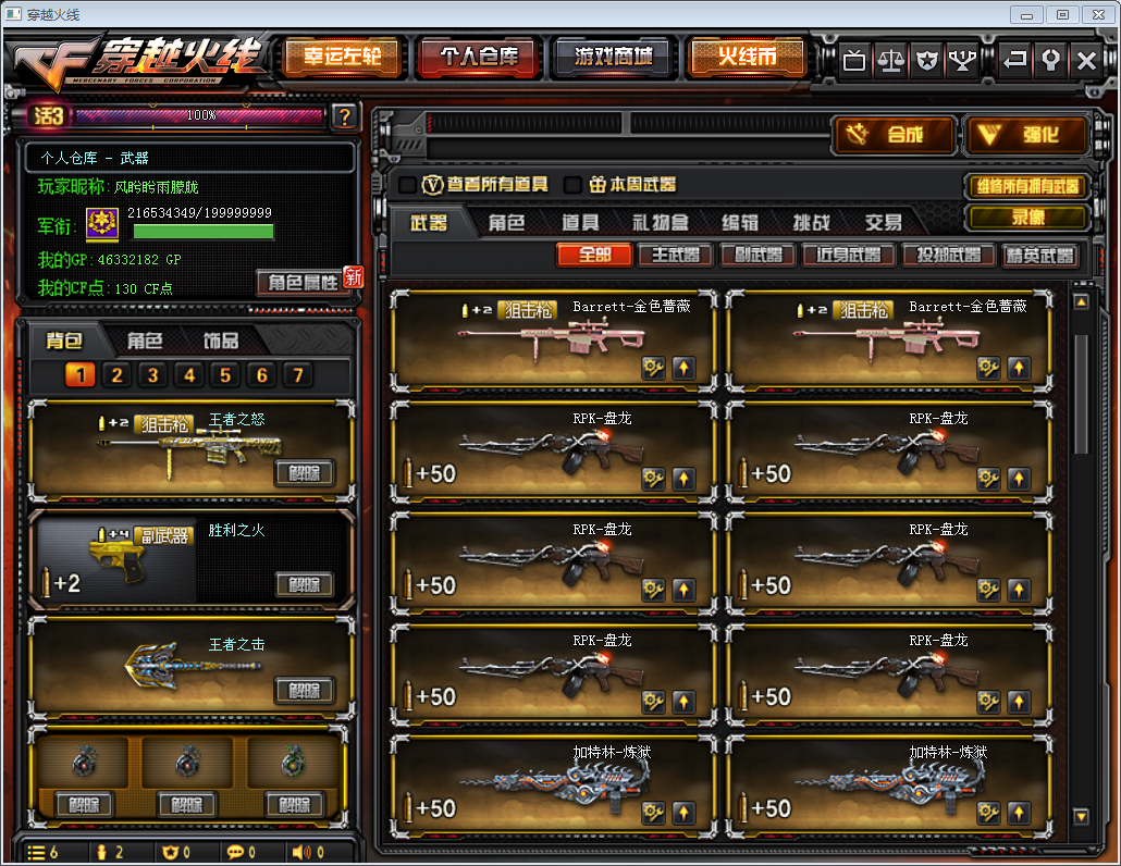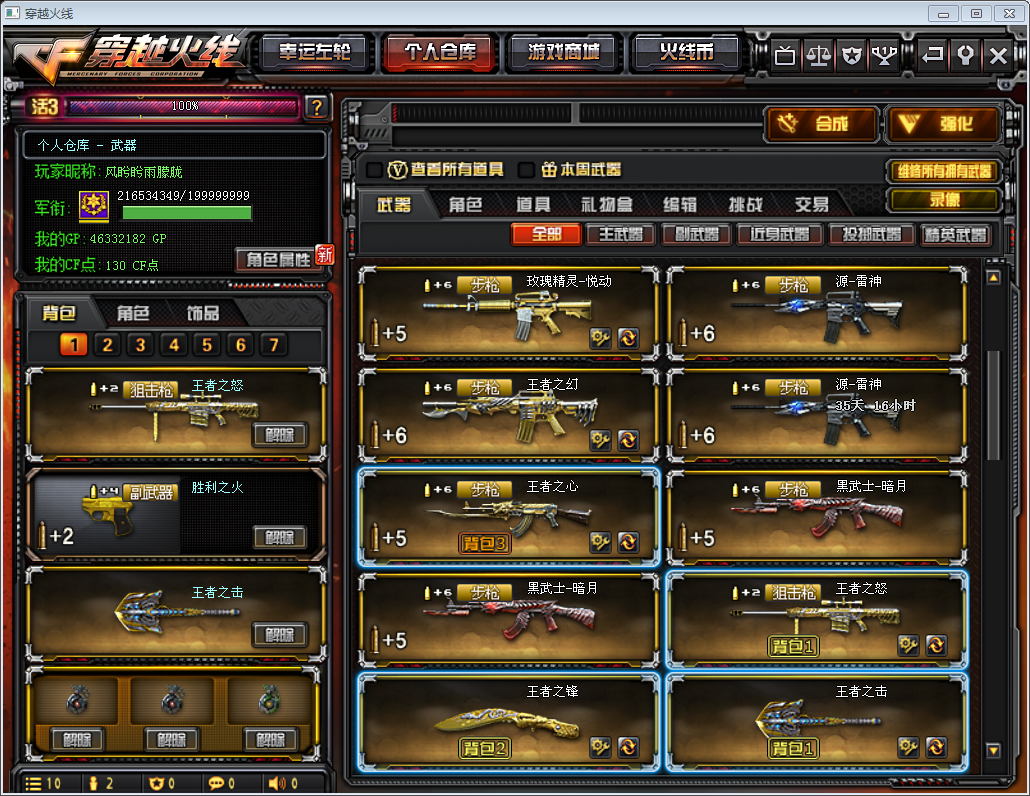 四川一区 | 编号:XX87 ┃133V┃爆破号┃生化号┃ 角色:大元首 VIP6、零、葵、樱、蝴蝶、王者-零 幻影、复仇者、堕天使、雷霆αβ 陈龙野X、威锋…瞳 审判者 王者之瞳、圣龙戒、魔龙戒、金蛇戒、银蛇戒 8周年戒1/2、电竞教官云悠悠 主武器:m200竞技荣光套、王者之心、王者之武、王者之魄、王者之怒、玫瑰精灵-悦动、超新星-悦享、雷神X3(暗月/染色包)、黑骑士X2(暗月)、千变、武胜、黑龙(暗月)、死神(秘银)、玫瑰精灵、火麒麟X2(染色包)、无影X3(能量核心)、麒麟、黑武士、机械迷城、AK12天启、AN94超新星、QBZ95幻兽、AWM天龙X2、巴雷特-毁灭X4(暗月)、巴雷特-极光X2、RPK盘龙X6、加特林炼狱X4、汤姆逊-烈龙X6、征服者、乱世、神罚、苍雷、AK47-泰坦破坏者、AK47-绝迹 副武器:破空枪刃、沙鹰-修罗X8(能量核心/染色包)、沙鹰-天神X6、Glock18-武圣、沙鹰-幻兽X5、 近身武器:屠龙X4、龙啸、擎天、麒麟刺、女皇利刃-幻兽、王者之击、王者之锋 投郑武器:高爆手雷-幻兽X5、高爆-凤凰之息X2… 闪光弹-幻兽X5、闪光弹-胜利之光X6、闪光弹-纪念版X3、闪光弹…烟雾弹-幻兽X5、烟雾弹-纪念版(红烟)、激浪烟雾弹(绿色)…部分期限蓝烟、黄烟、绿烟 爆破全装:烟雾头盔、闪光护目镜、C4工具钳、防弹衣、防弹头盔、雷包、步枪弹夹、狙击枪弹夹、散弹枪弹夹、手枪弹夹、炫彩背包、自定义喷涂… 生化全装:7号背包全开、防化服、生化弹夹、冲锋枪弹夹、机枪弹夹、变异宝贝、妖姬、疯狂宝贝;USP-雷暴,电竞教官-云悠悠,RPK-盘龙,QBZ03-金色蔷薇,