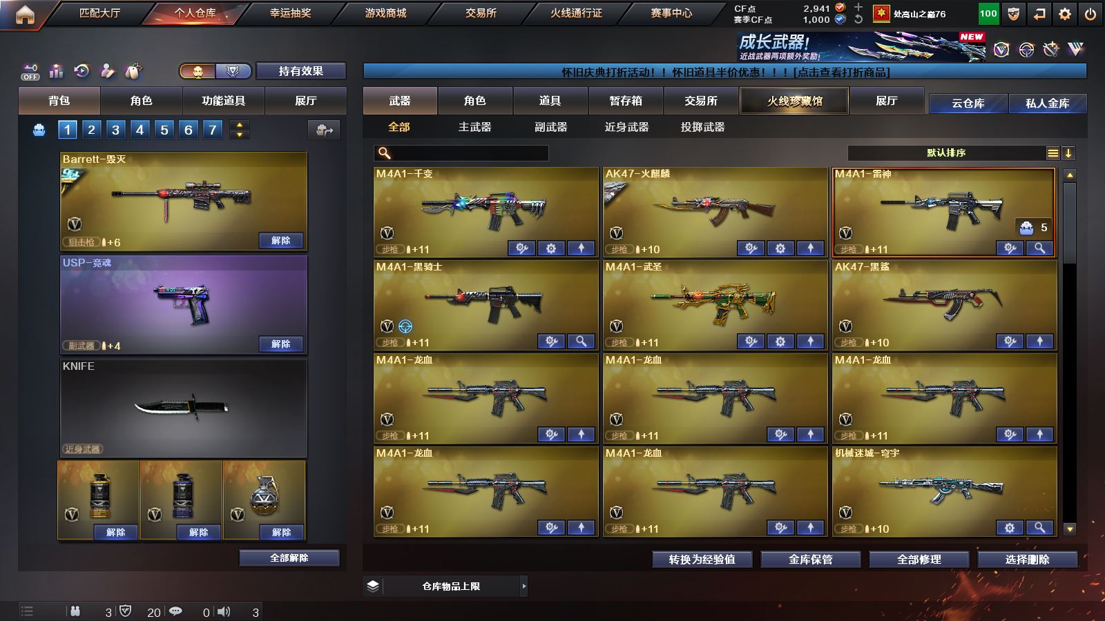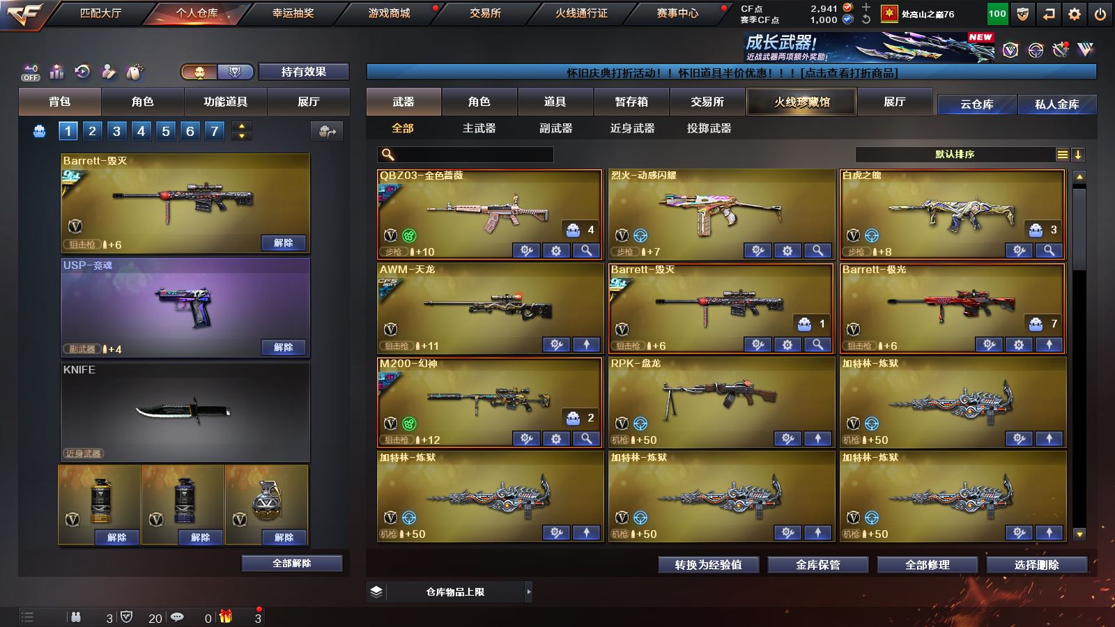 【M200幻神+荣耀白鲨皮肤+黄忠皮肤】【6炼狱+盘龙】【白虎之魄】【qbz03金色蔷薇+荣耀世冠白鲨皮肤】【王者之城 王者蔷薇】【火麒麟+火麒麟音效卡】【雷神+CFPLS18冠军皮肤】【毁灭+毁灭音效卡+冠军之怒皮肤】【千变 黑骑士 武圣 黑鲨 龙血 穹宇 烈火动感闪耀 天龙 极光】——【沙鹰修罗 天神动感闪耀】——【屠龙 龙啸 擎天 尼泊尔雷霆 斩神刀雷暴 屠龙动感闪耀 王者之啸】——【雷霆投掷武器套装 雷暴投掷武器套装 幻灵投掷武器套装*2】——【热门武器/小人枪】【赤狱骑士 火麒麟灵狐 炫金雷神 炼狱迷你小钢 cop白鲨 黑桃战神】——【角色】【零 迷迭香 樱】;RPK-盘龙,QBZ03-金色蔷薇,M200-幻神,