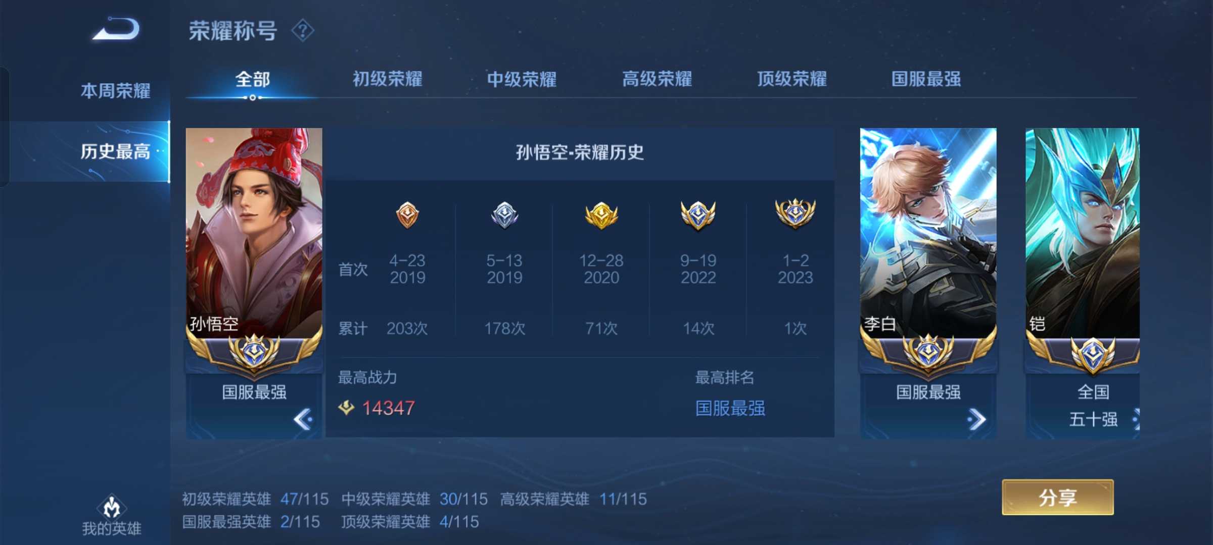 立即租号首页 > 租号大厅 > 王者荣耀 > 标题写明区服/QQ > ☀鸣剑曳影☀历史国服猴子国服李白☀打野53段☀可排位