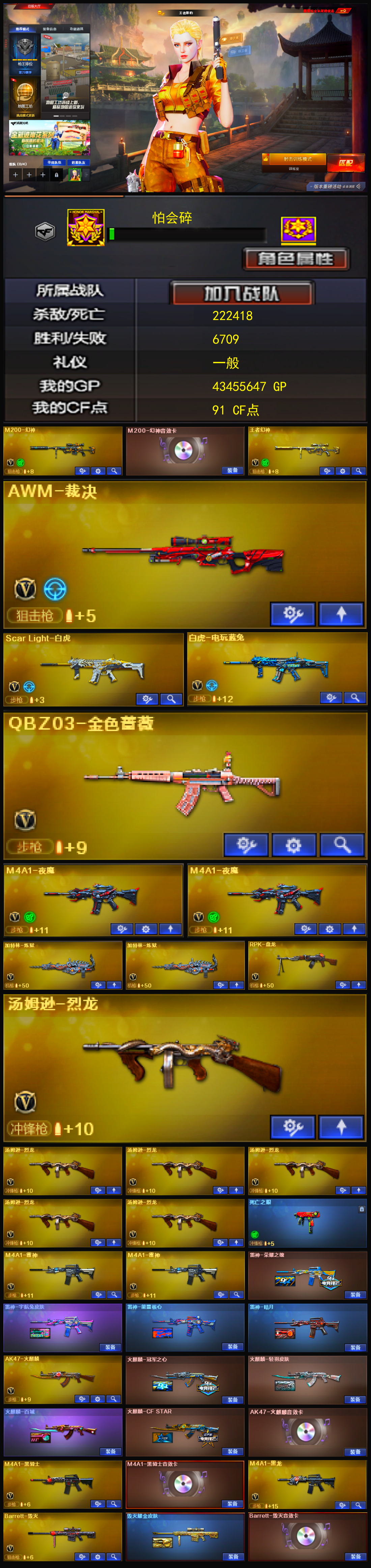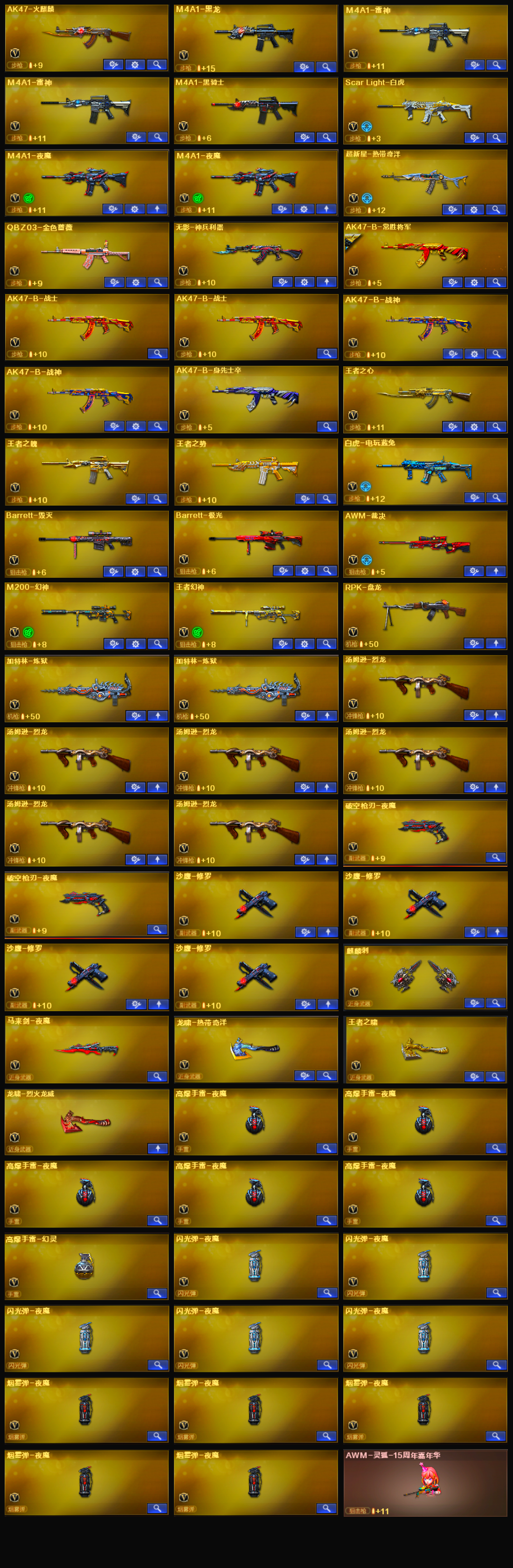 【m200幻神+音效卡】【王者幻神】【6烈龙 盘龙 炼狱*2】【scar白虎】【qbz金色蔷薇】【火麒麟+卡+冠军之心】【黑龙】【雷神+荣耀之魄】【黑骑士+卡】【毁灭+卡】【极光】【裁决】【夜魔套】 【武器:夜魔 王者之心 王者之魄 王者之势 】 【6手呛:修罗*4 夜魔*2 】 【4刀具:麒麟刺 马来剑夜魔 王者之啸 龙啸烈火龙威】 【5雷套:夜魔雷*5】 【小人呛:】 【音效卡:火麒麟音效卡 黑骑士音效卡 幻神音效卡 毁灭音效卡 】 【四防角色:王者影豹】;RPK-盘龙,QBZ03-金色蔷薇,M200-幻神,Scar Light-白虎,