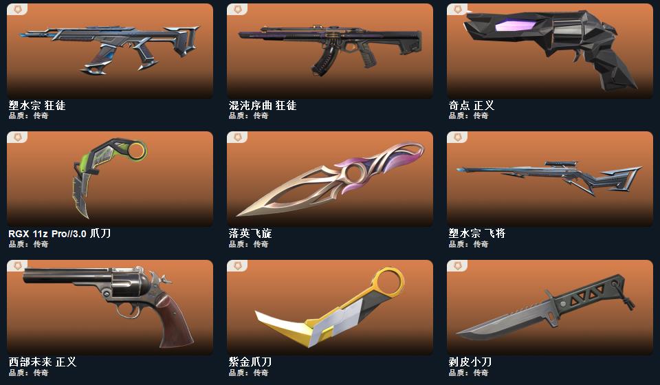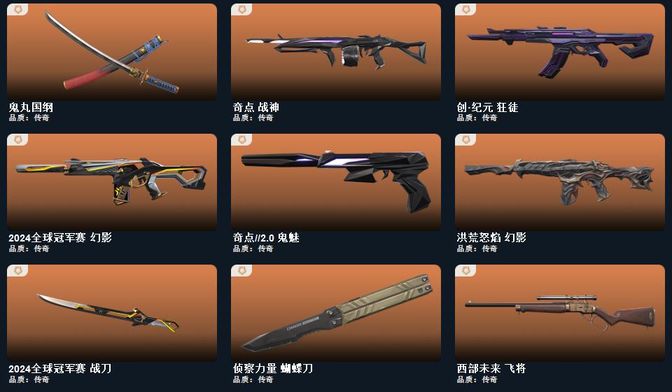 wegame无畏契约★刀皮数量18,枪皮数量131(绝版3限定38终极0卓越12),近战武器-2024全球冠军赛战刀,近战武器-显卡3.0爪刀,近战武器-闪耀之星荧光棒,近战武器-鬼丸国纲,近战武器-RGX11zPro2.0蝴蝶刀,近战武器-剥皮小刀,幻影-2024全球冠军赛,标配-RGX11zPro2.0,鬼魅-奇点2.0,鬼魅-破败军械,正义-奇点,正义-西部未来,骇灵-RGX11zPro2.0,狂徒-塑水宗,狂徒-归零者,狂徒-混沌序曲,狂徒-创纪元,幻影-RGX11z