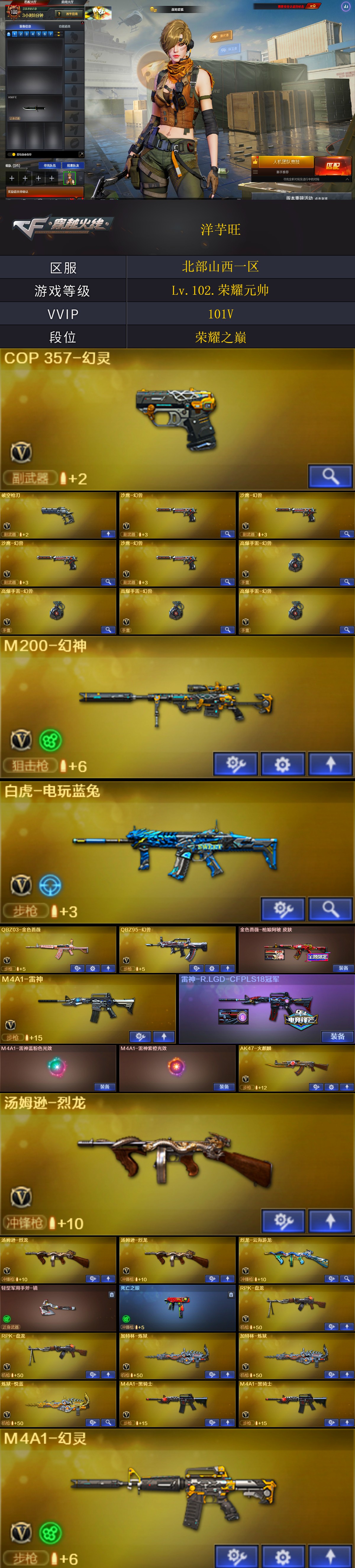 【稀有武器】:M200-幻神/M4A1-幻灵/COP357-幻灵/天神-动感闪耀/修罗-云海游龙/破空枪刃/沙鹰-幻兽(4)/QBZ03-金色蔷薇/QBZ95-幻兽/AK47-火麒麟/M4A1-黑龙/M4A1-雷神(5)/M4A1-黑骑士(2)/AK47-无影/AK47-黑武士(2)/白虎-电玩蓝兔/Barrett-毁灭/Barrett-极光(2)/RPK-盘龙(2)/加特林-炼狱(2)/汤姆逊-烈龙(3)/AA-12-雷霆/斩神刀-雷暴/女皇利刃-幻兽 【王者武器】: 【热门角色】:奇洋探员/乔伊教练/王者-葵-貂蝉/王者涂鸦/空/潘多拉-X/兔囡囡/潘多拉 【热门音效卡】:Barrett-毁灭音效卡/M4A1-黑骑士音效卡/M4A1-黑龙音效卡 【热门皮肤】:雷神-R.LGD-CFPLS18冠军/金色蔷薇-枪娘阿敏皮肤 【其他亮点】:海神三叉戟/贝雷塔687-射手座/金刚伞-电玩红兔;RPK-盘龙,QBZ03-金色蔷薇,M200-幻神,