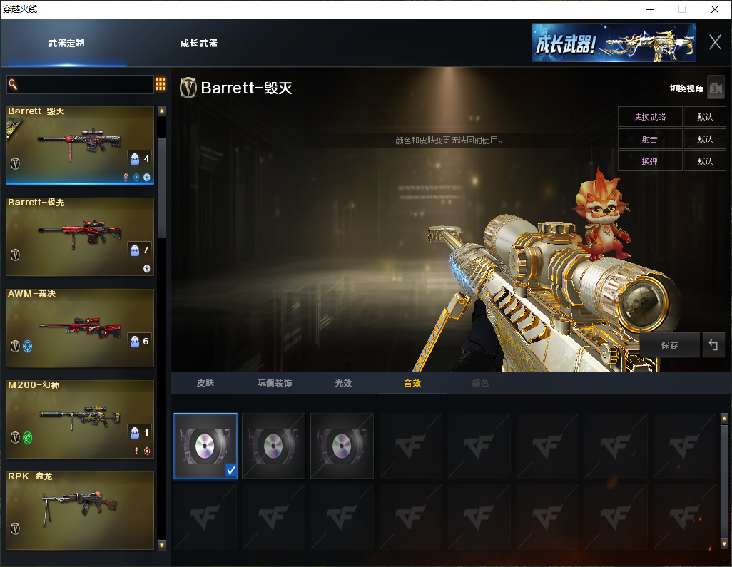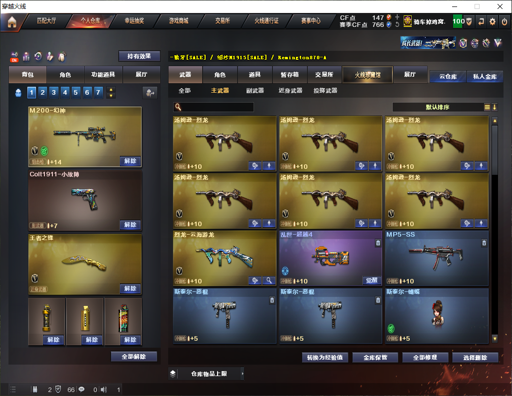 【主武器】M200-幻神/白虎电玩蓝兔/斯太尔蝴蝶/②炼狱/⑥烈龙④盘龙/火麒麟/黑龙/雷神/黑骑士/死神/超新星/黑鲨/黑武士/超新星热带奇洋/玫瑰精灵/蔷薇qbz/烈火/烈火动感闪耀/猩红传说/常胜将军/天龙/毁灭/极光/裁决/③暗月传说大炮/苍鸣雷神/雷神精英刀锋/毁灭孙三炮/②集束激光超越Max2+2/机甲撕裂者3/激光毁灭者3/末日审判者3/巨龙咆哮3/金魔/擎天柱3/神圣爆裂者+末日3/死亡之眼/EVO赤血龙魂 【副武器】②修罗/天神/天神动感闪耀/涂鸦手枪 【近身武器】②王者之峰觉醒版/屠龙/擎天/②麒麟刺/幻灵之峰/屠龙动感闪耀/擎天云海游龙/龙啸热带奇洋/金刚伞电玩红兔/黄金尼泊尔/迷你牛牛冰龙火种白狐博士/屠龙秘银/②手斧镜 【投掷武器】生化手雷/高爆幻灵/手雷动感闪耀/手雷云海游龙/手雷热带奇洋/ 【角色】王者零/樱/葵/奇洋探员/乔伊教练/云海游龙/兰海滩派对/对讲机/炫彩背包/②戒指 【皮肤】火麒麟-华夏之心皮肤/毁灭-耀金皮肤/烈火动感闪耀皮肤 【音效卡】毁灭音效卡/火麒麟音效卡/雷神音效卡/极光音效卡/黑骑士音效卡/超新星热带奇洋音效卡 【道具】元首/全背包/VIP4/AC/烟雾头/变异宝贝/疯狂宝贝/迷雾幽灵/绿巨人/灵魂忍者/妖姬/步枪/生化弹夹/爆破挑战号;RPK-盘龙,QBZ03-金色蔷薇,M200-幻神,