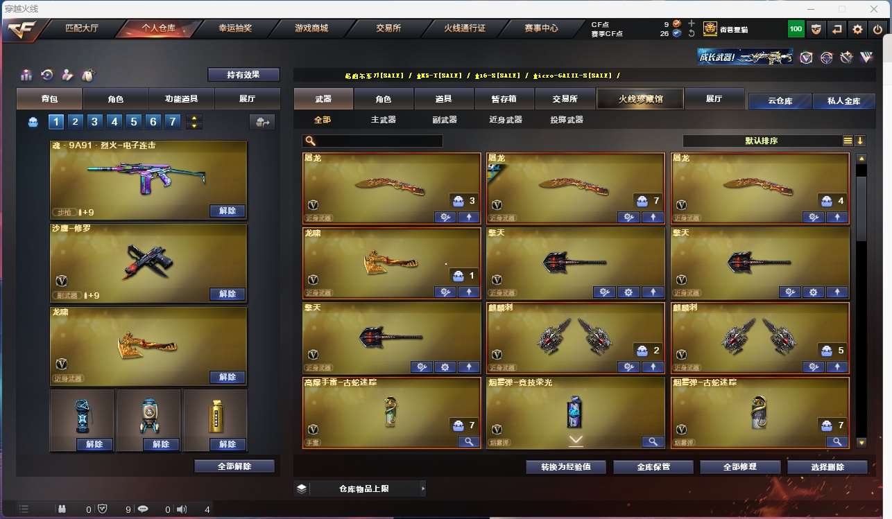 【6烈龙 炼狱 斯太尔蝴蝶】【scar白虎】【qbz金色蔷薇+卡】【火麒麟】【黑龙】【雷神】【黑骑士+卡】【毁灭+卡+冠军之怒】【极光】【裁决】 【武器:武圣 王者之武 王者之势 海王 天龙 】 【8手呛:修罗*5 天神*2 武圣】 【9刀具:屠龙*4 龙啸 擎天*3 麒麟刺*2】 【小人呛:朱雀蛇隐宗】 【音效卡: 黑骑士音效卡 金色蔷薇音效卡 毁灭音效卡】 【角色:葵 瞳 樱 王者之瞳】;QBZ03-金色蔷薇,Scar Light-白虎,