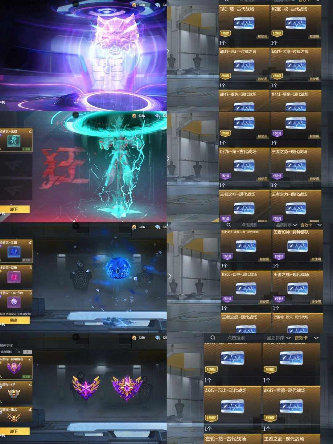 ❤️V10极品~春~钟小葵 ❤️七把王者之锋-三把紫电王锋-两拉丝-两冰皮 ❤️王者之力紫电熔岩-带音效卡 ❤️王者幻神紫电熔岩-带音效卡 ❤️王者之势紫电熔岩-带音效卡 ❤️M4雷霆王者-王者之圣-王者之技-王者之翎-王者之腾 ❤️王怒炫金-王心炫金-王影炫金 ❤️M200权-江东骸虎~仲达白露~元让过载~孟德过载~奉先无双~星象四圣~仁德赢魔~七宝葫芦黑曜~ ❤️江东骸虎最终消灭-奉先无双最终消灭-冰霜最终消灭② ❤️葫芦娃C4-道士拆弹-蚩尤拆弹-紫电熔岩消灭图标 ❤️一线音效卡齐全,消灭音效和抢线很多 ❤️六王烈王蝶-黑龙魂